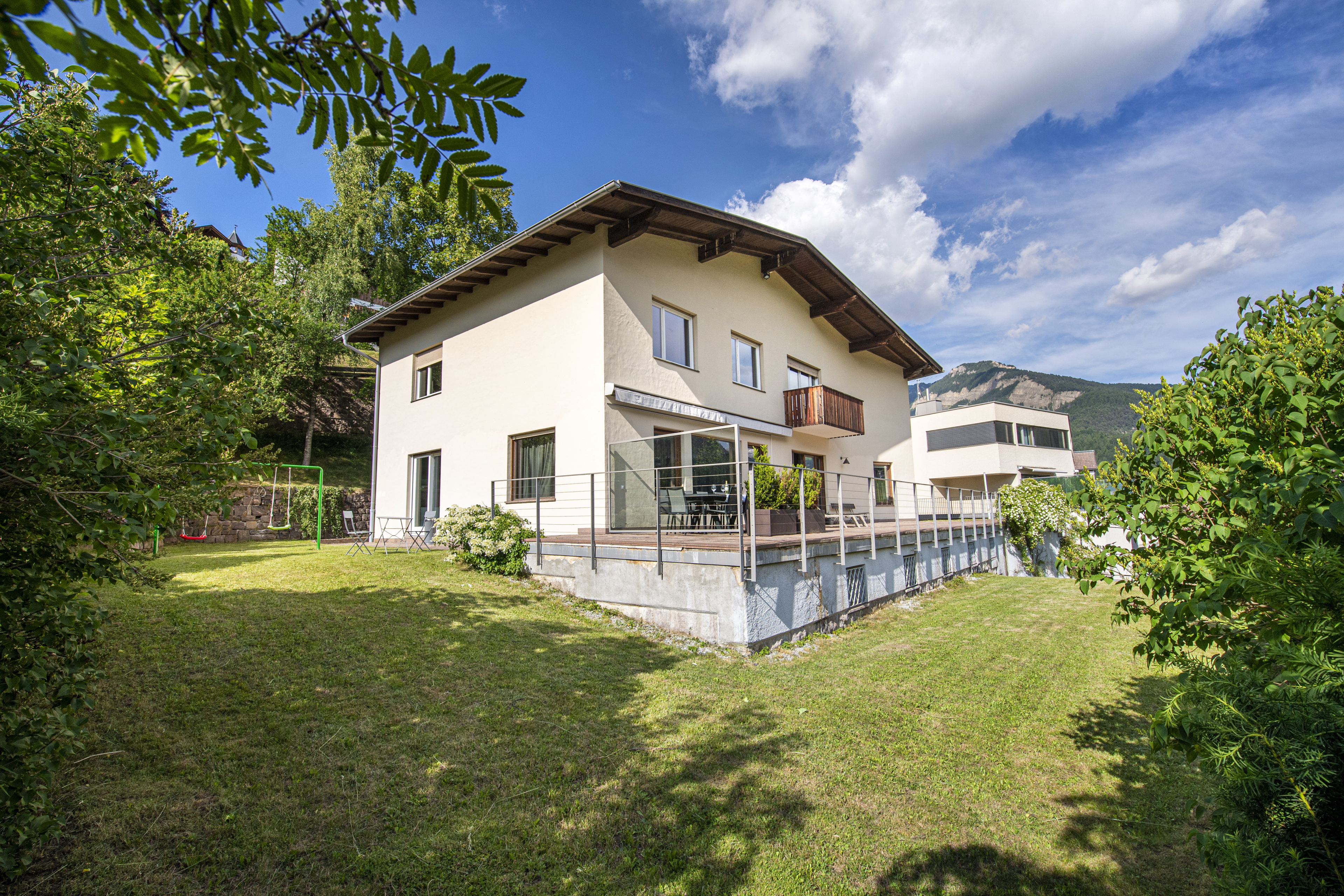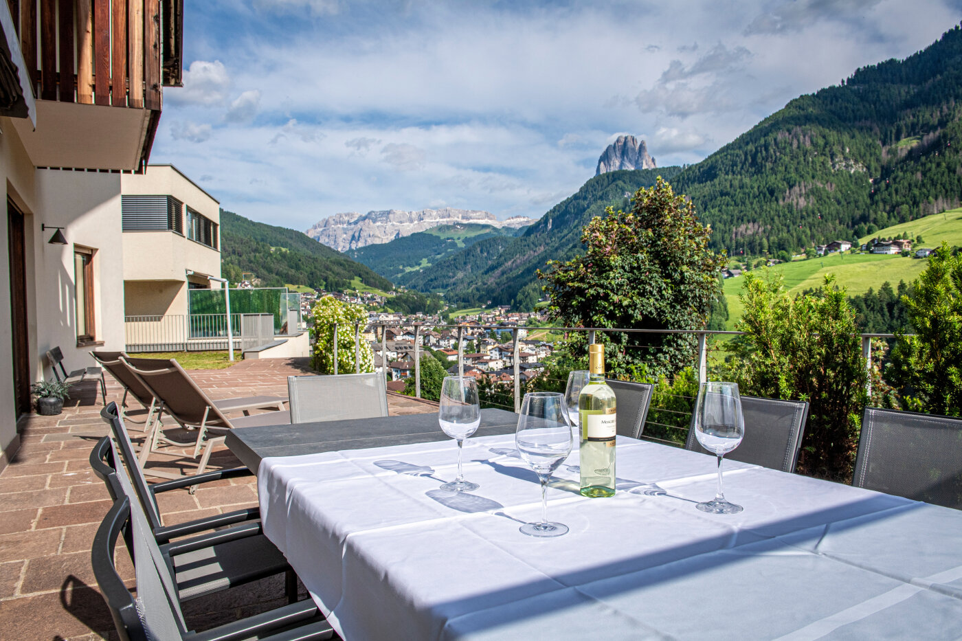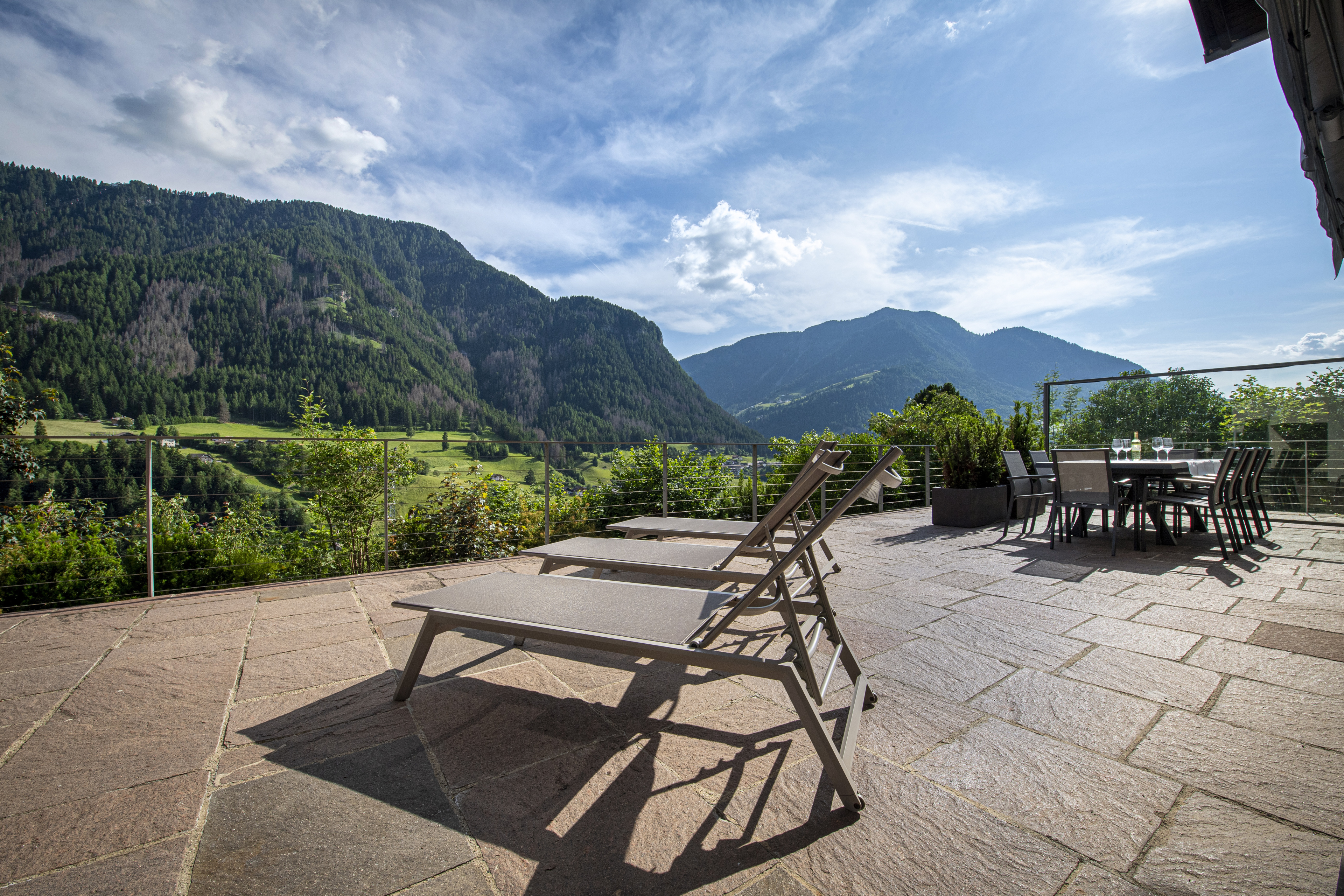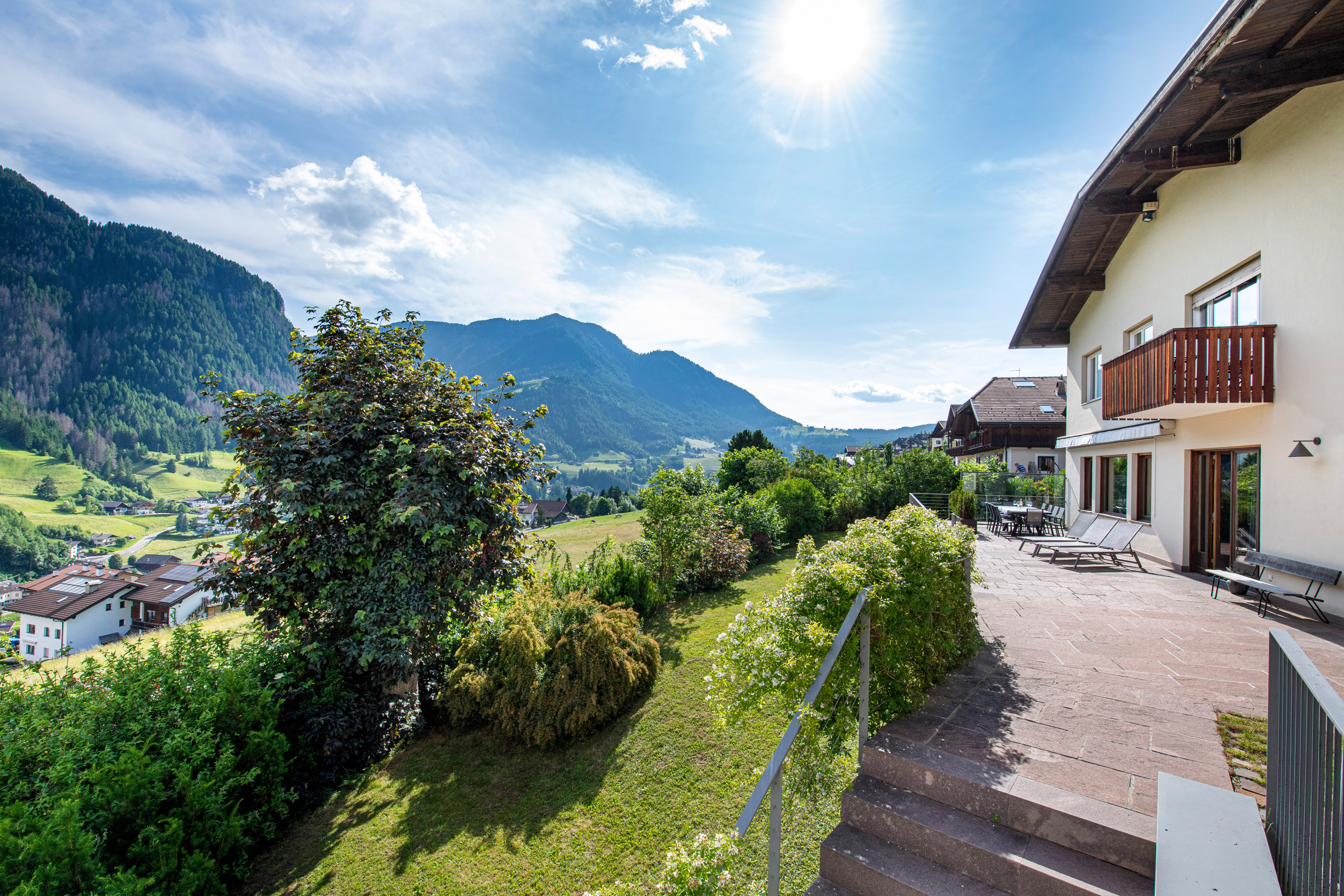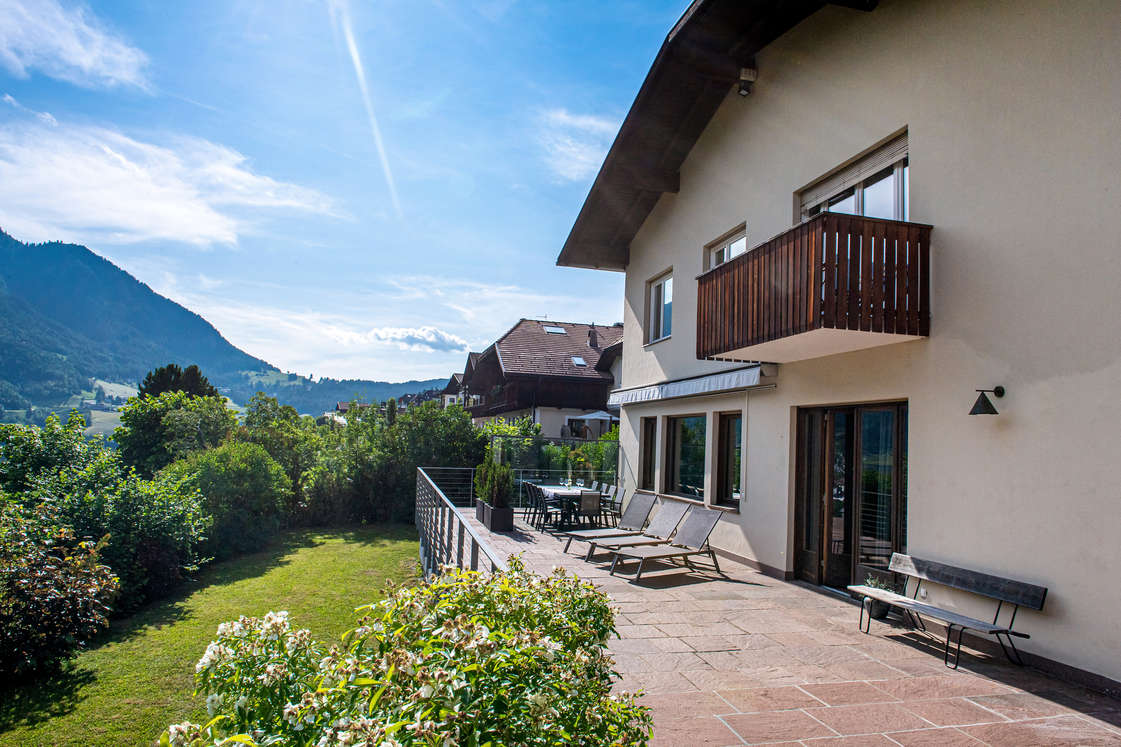 Der große Garten mit seiner Panoramaterrasse in Südlage lässt Sie die Dolomiten in vollen Zügen genießen. Dort können Sie in den wärmeren Monaten herrliche Abende genießen.