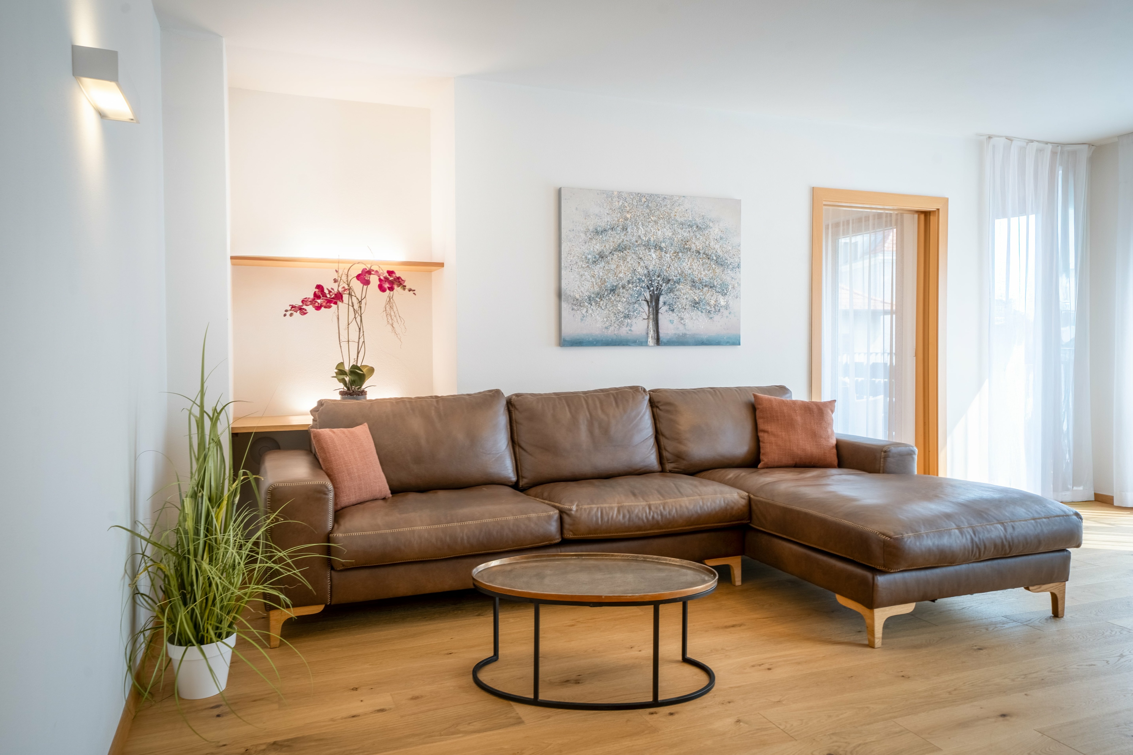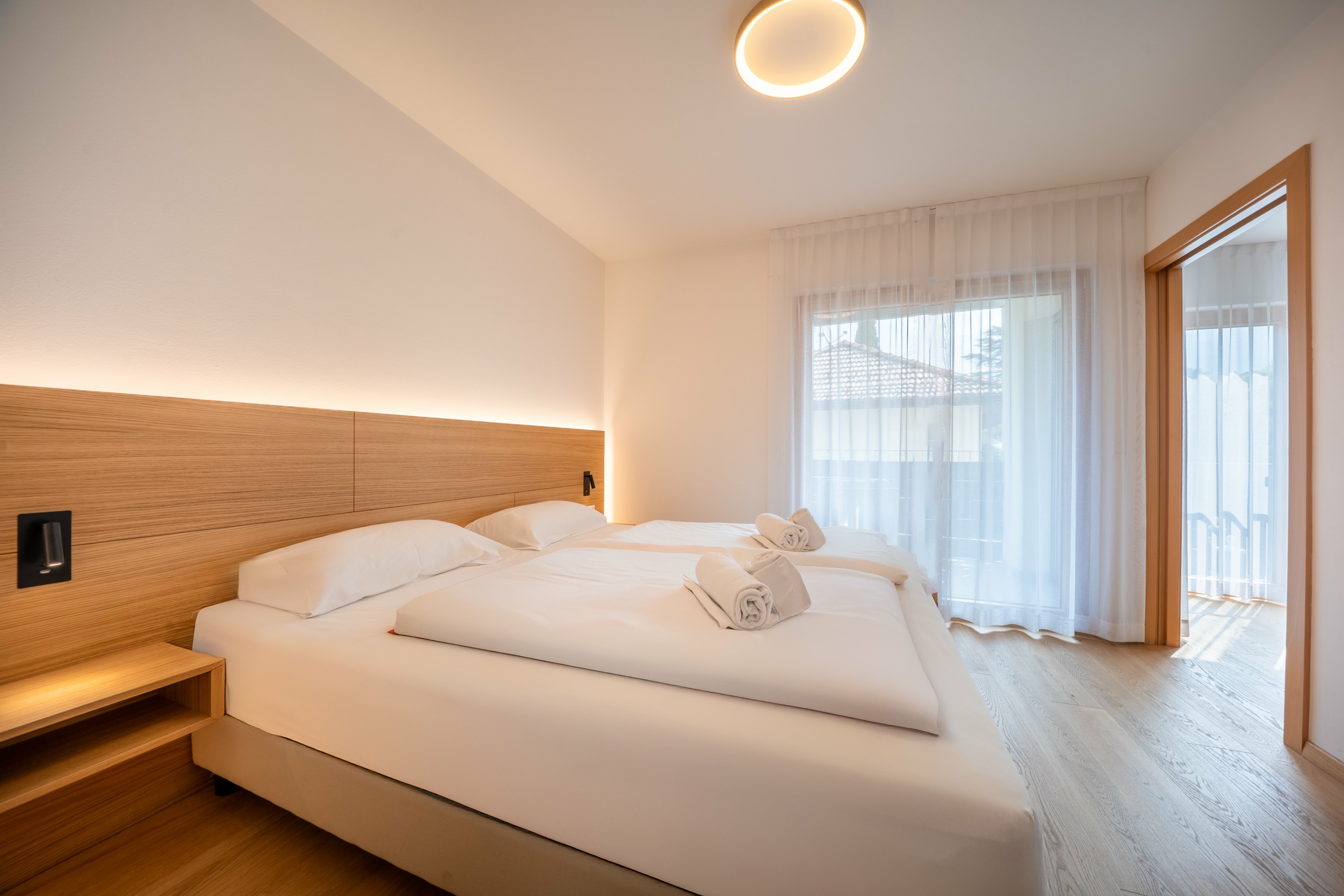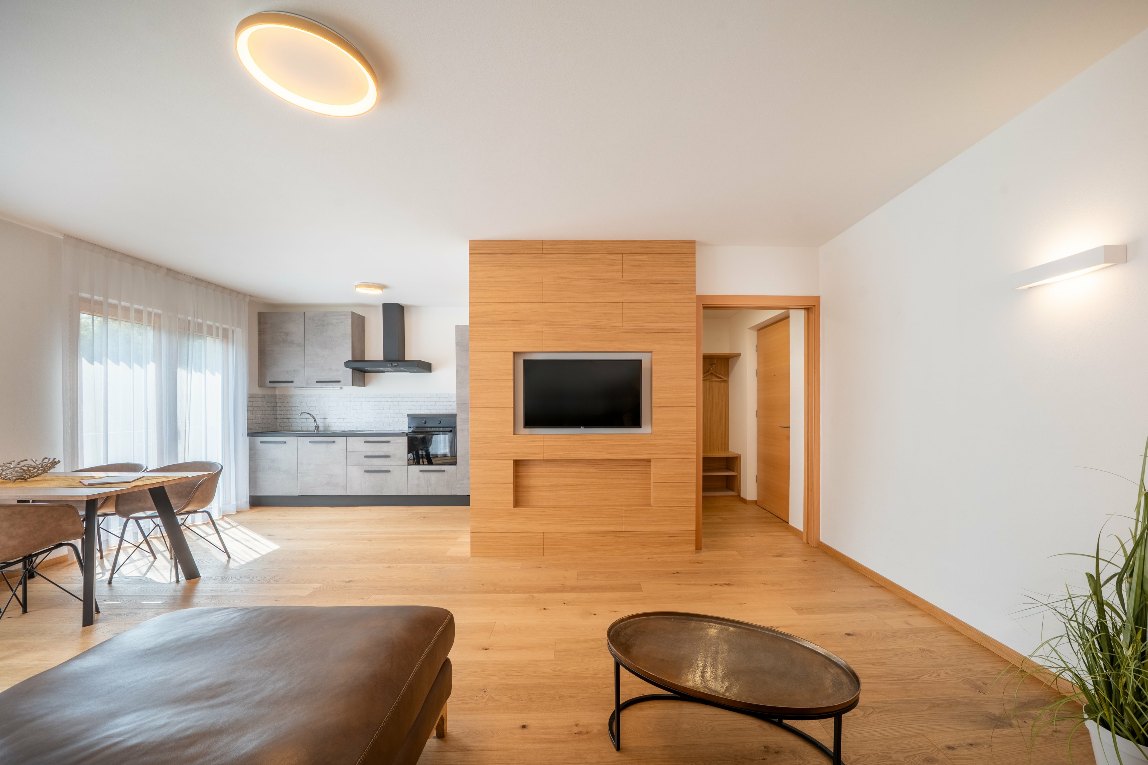 Die Unterkunft besteht aus einer hellen Wohnküche und einem Schlafzimmer mit eigenem Badezimmer – beide Räume sind lichtdurchflutet und stilvoll gestaltet.