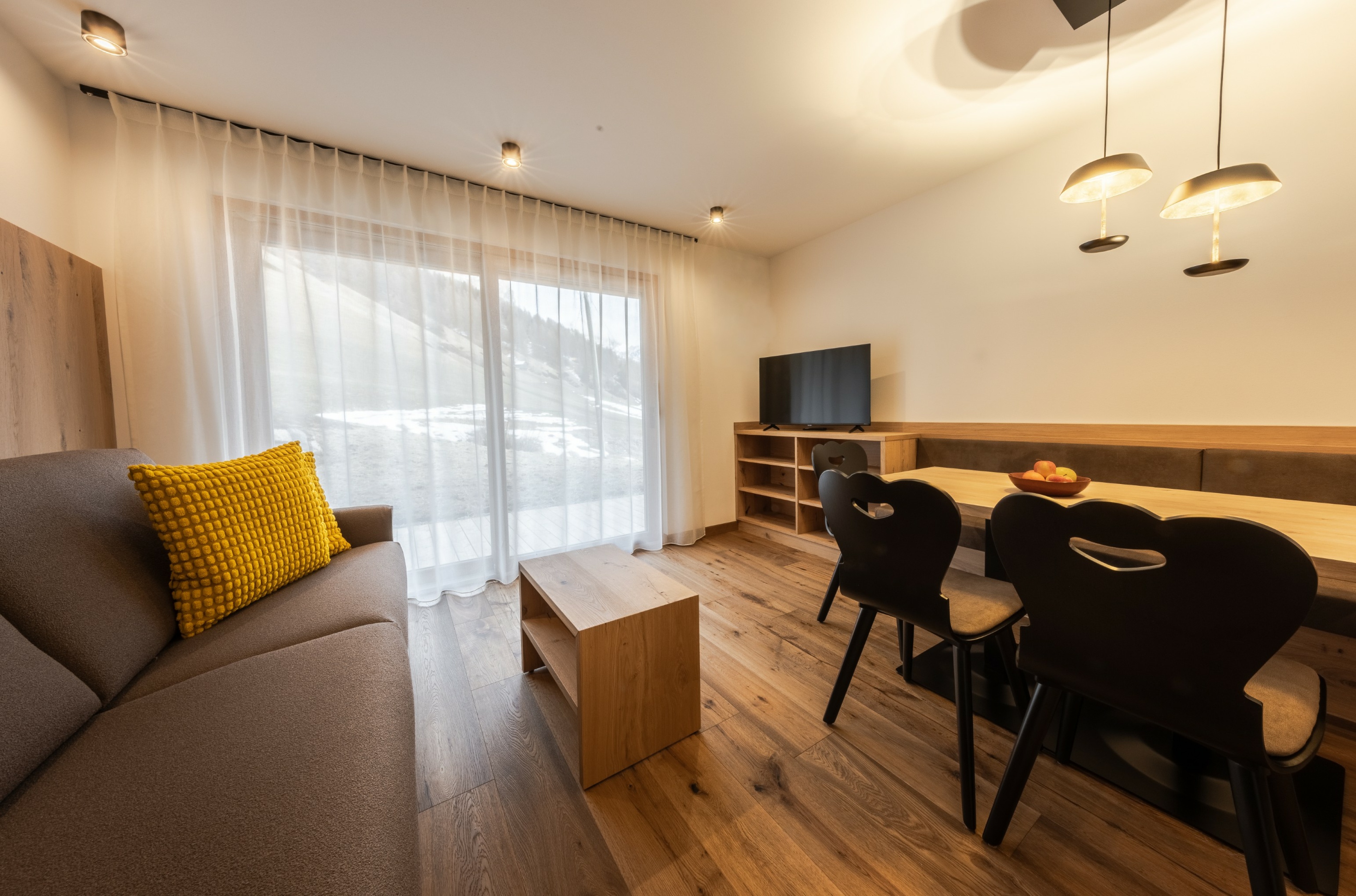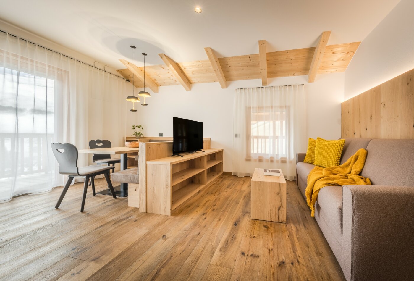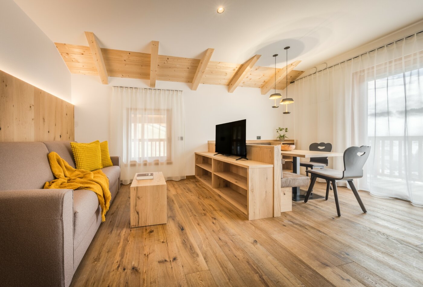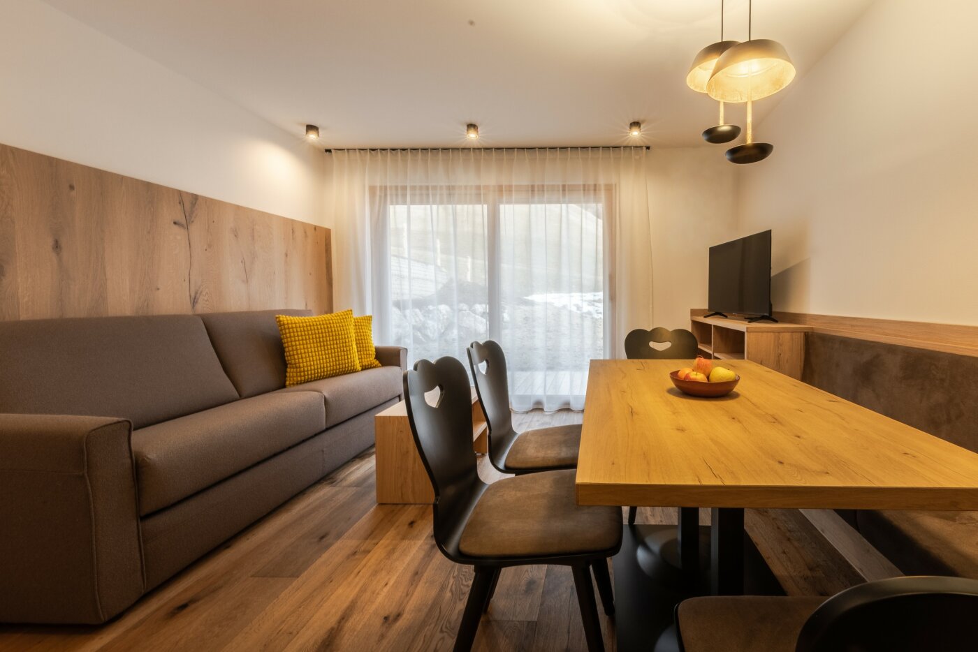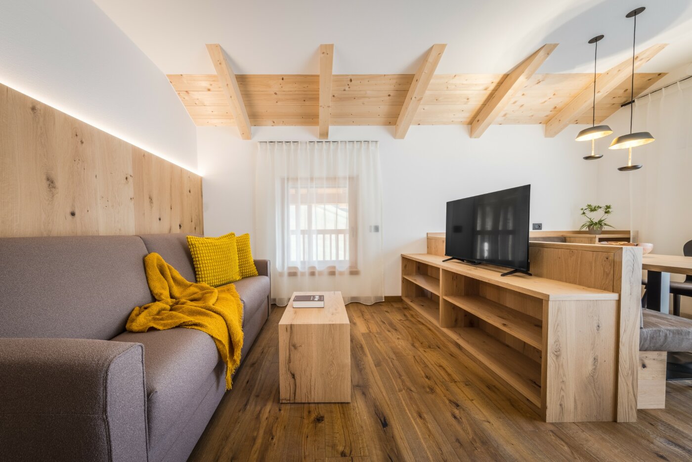 L’immobile è arredato con pregiato legno locale e si distingue per linee eleganti e armoniose, pensate per garantire il massimo comfort durante il vostro soggiorno nelle Dolomiti.