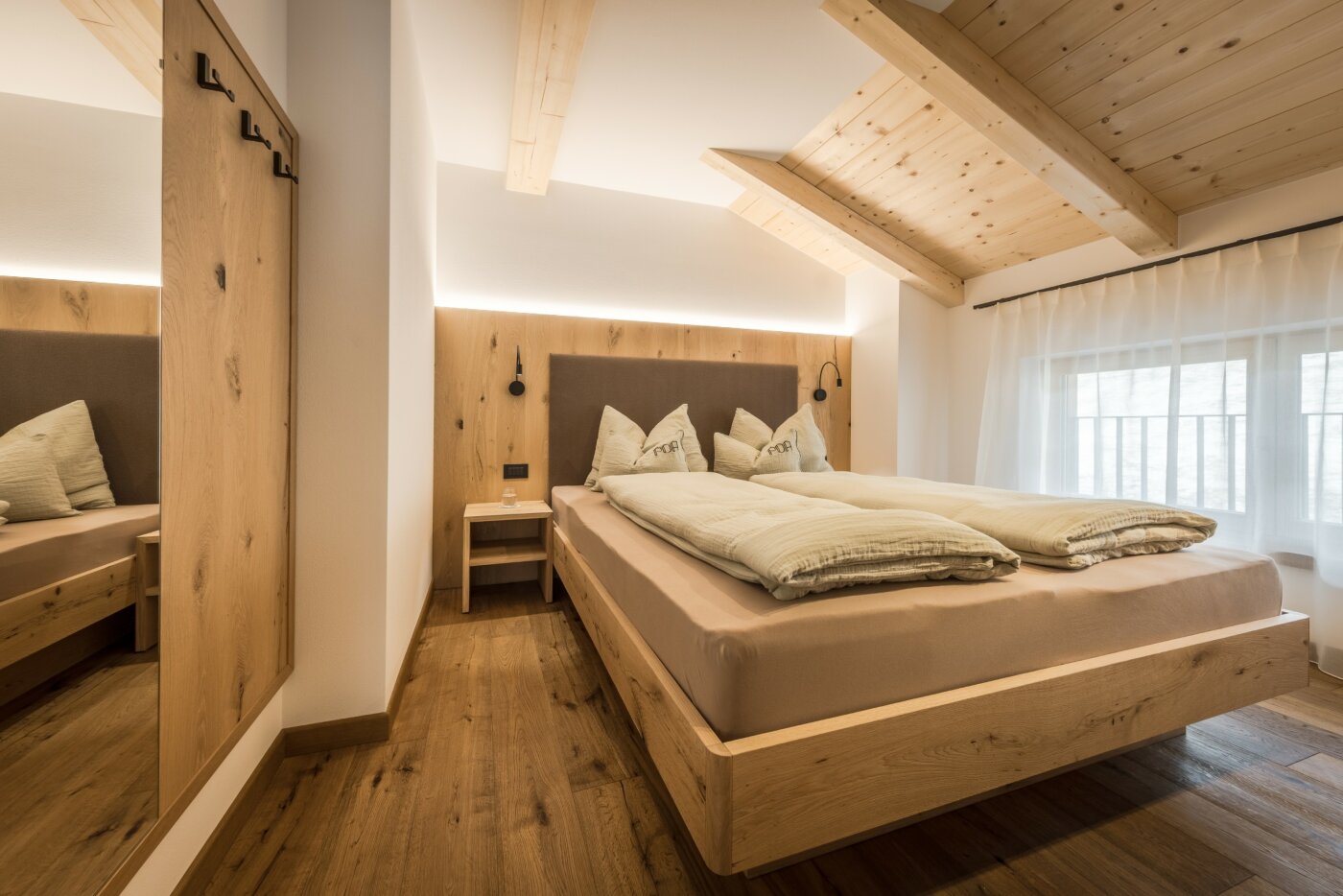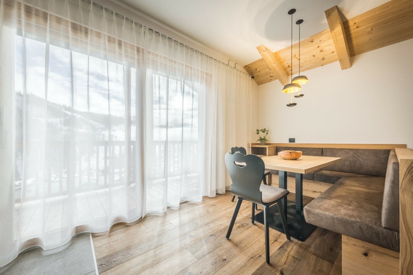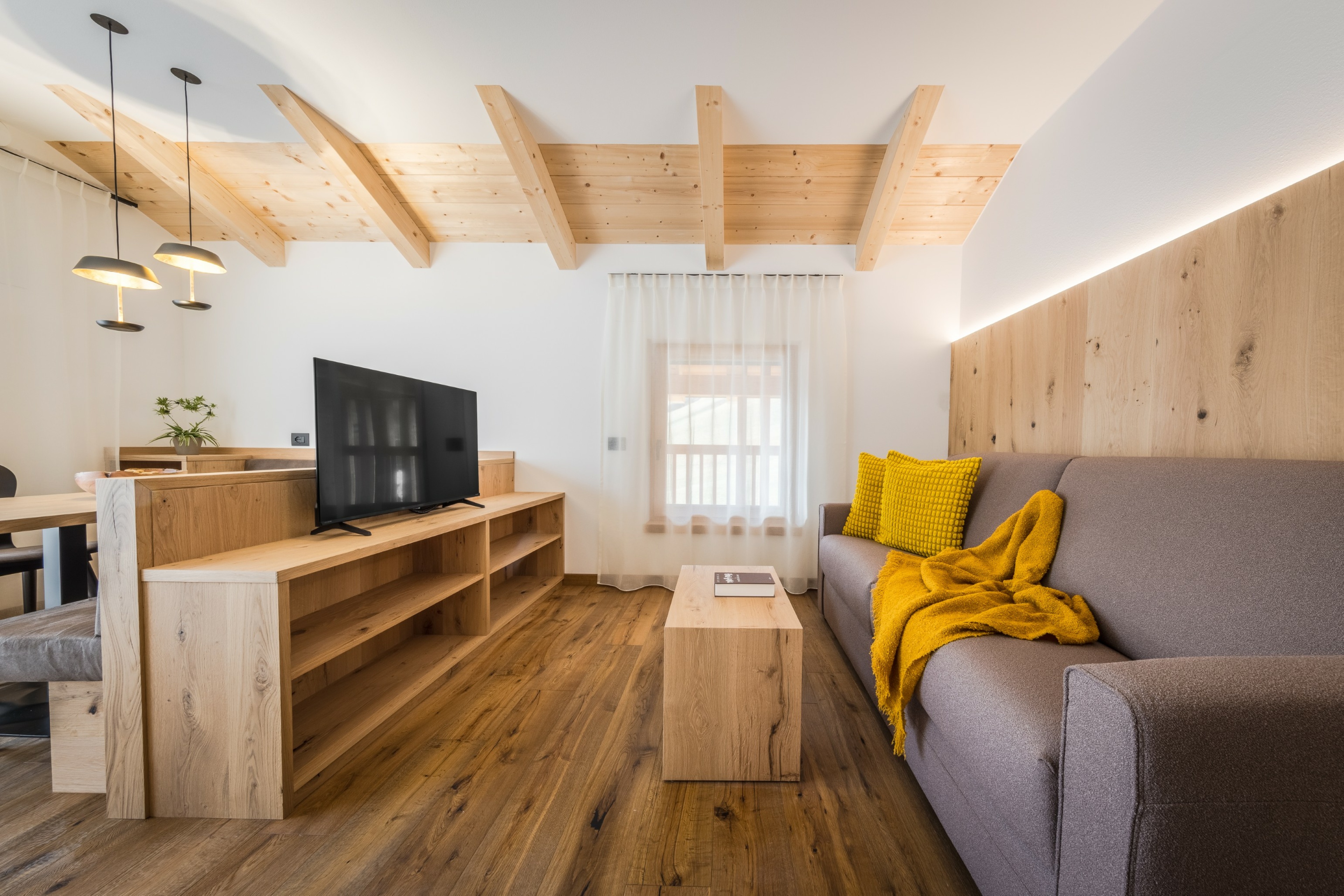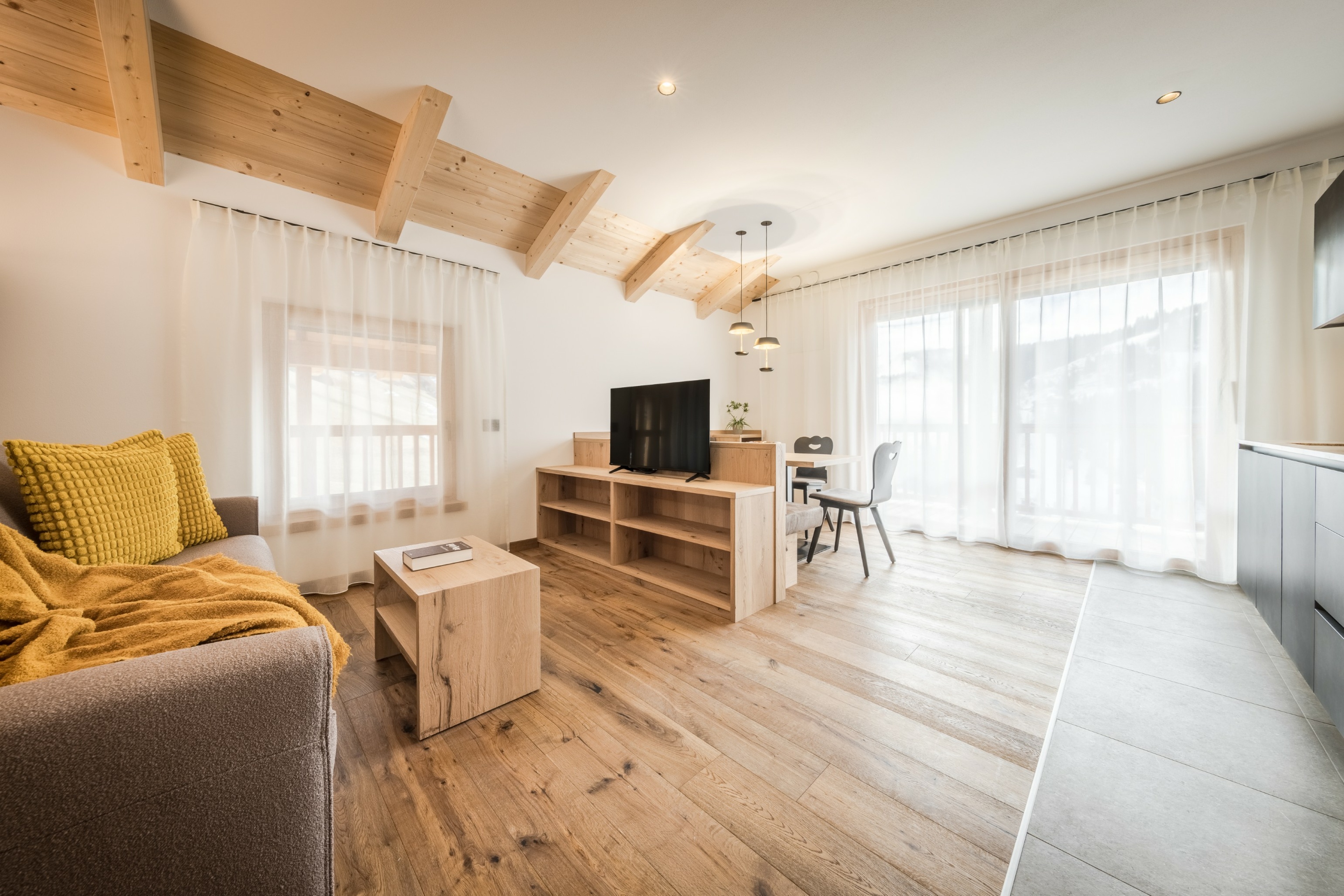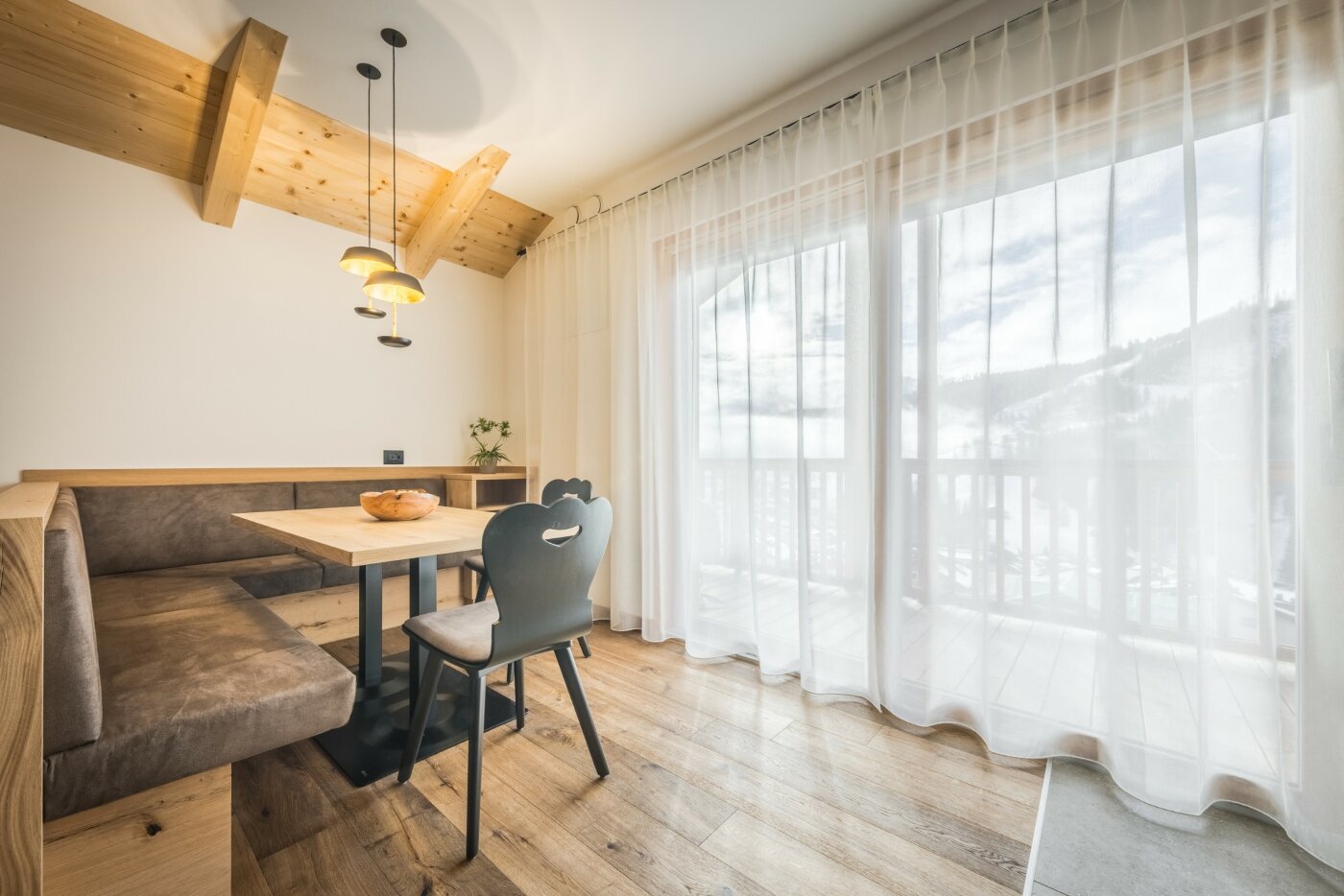 L’immobile è arredato con pregiato legno locale e si distingue per linee eleganti e armoniose, pensate per garantire il massimo comfort durante il vostro soggiorno nelle Dolomiti.