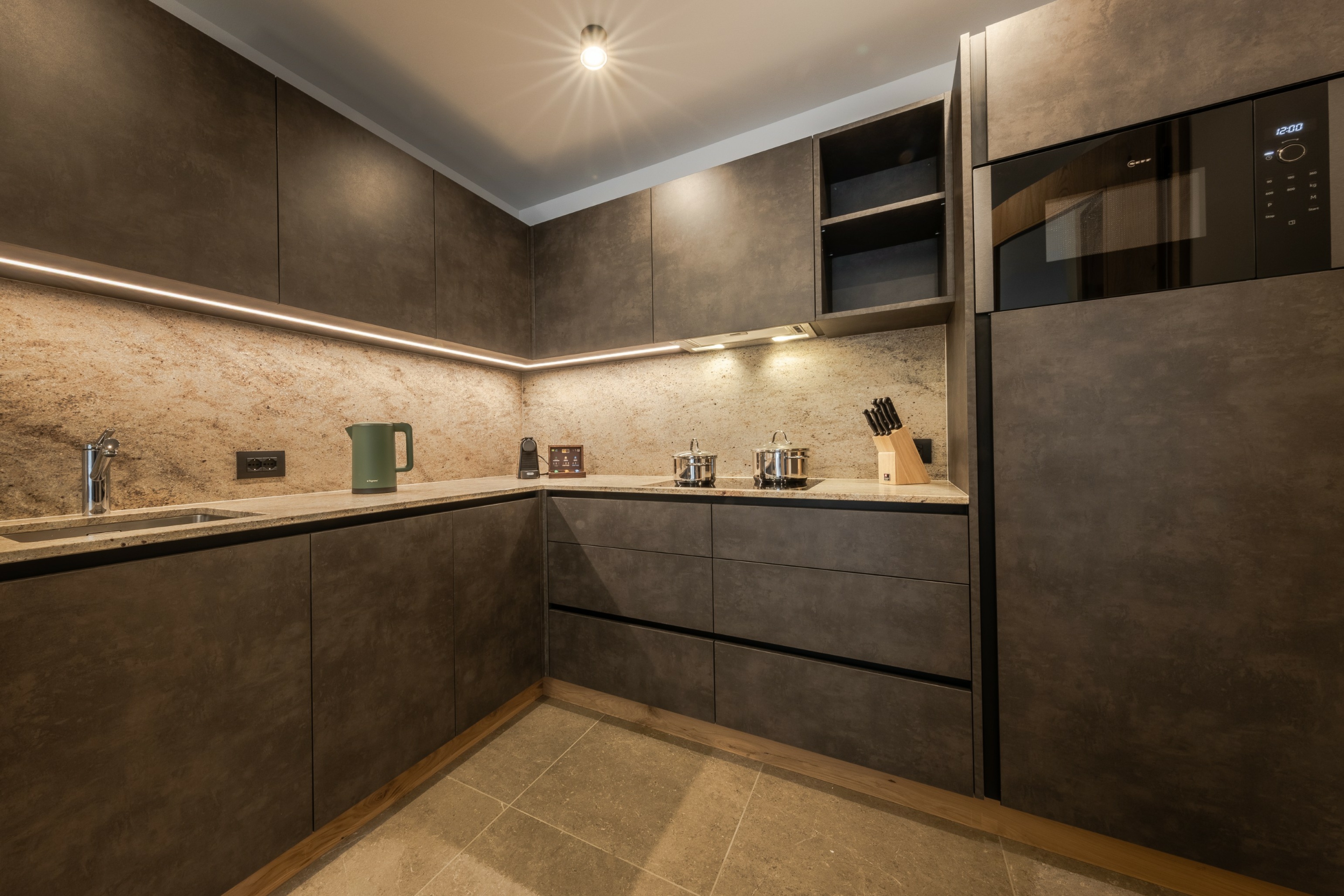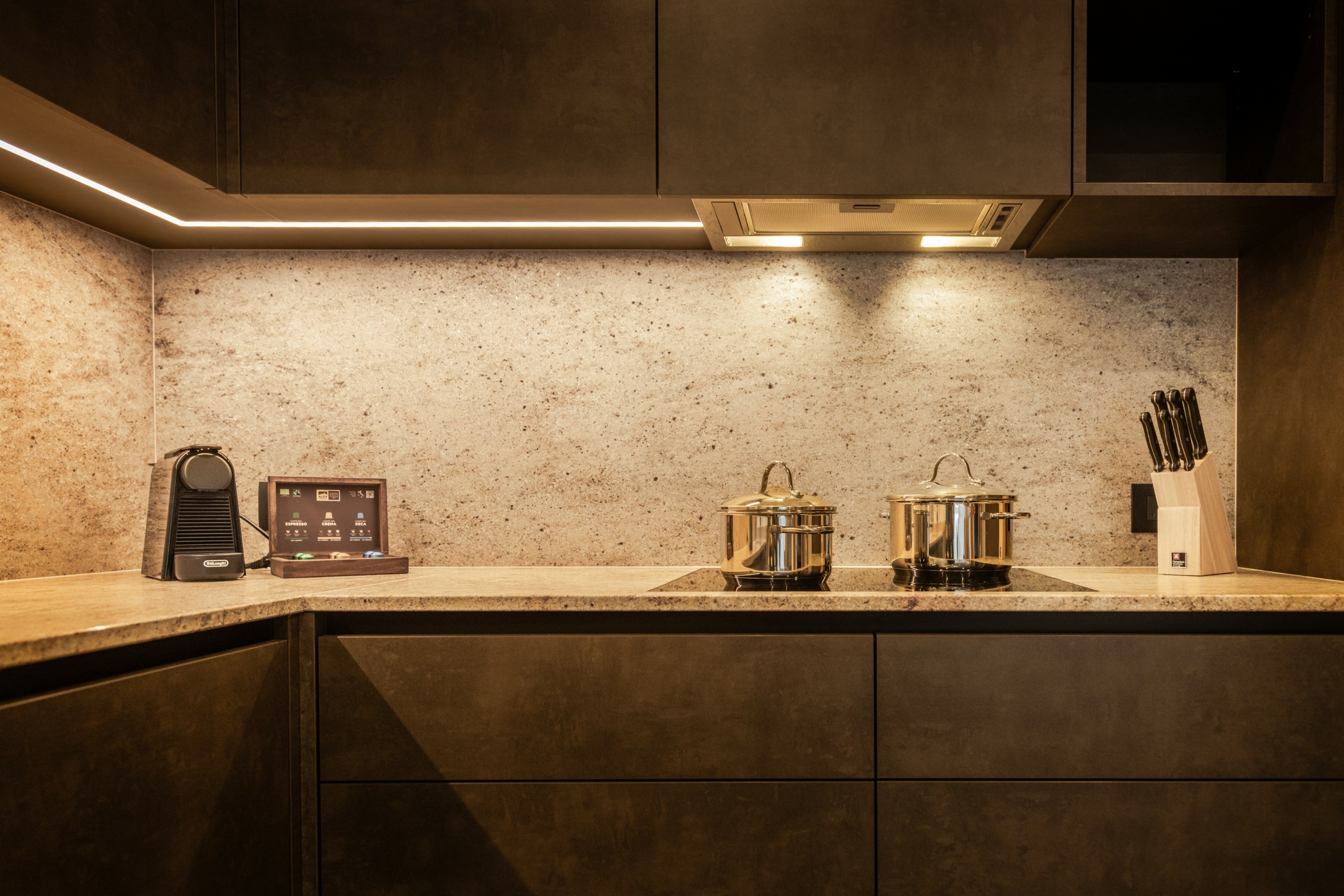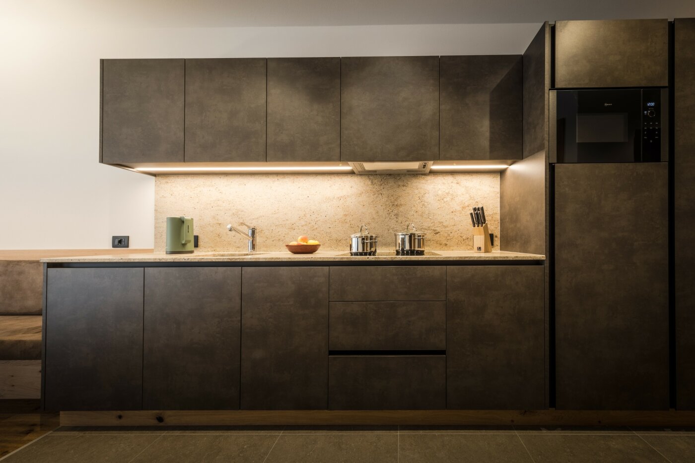 Il moderno cucinino separato è completamente attrezzato per le vostre vacanze in Alta Badia a e include lavastoviglie, piano cottura, macchina del caffè, forno a microonde, utensili da cucina, stoviglie e posate.