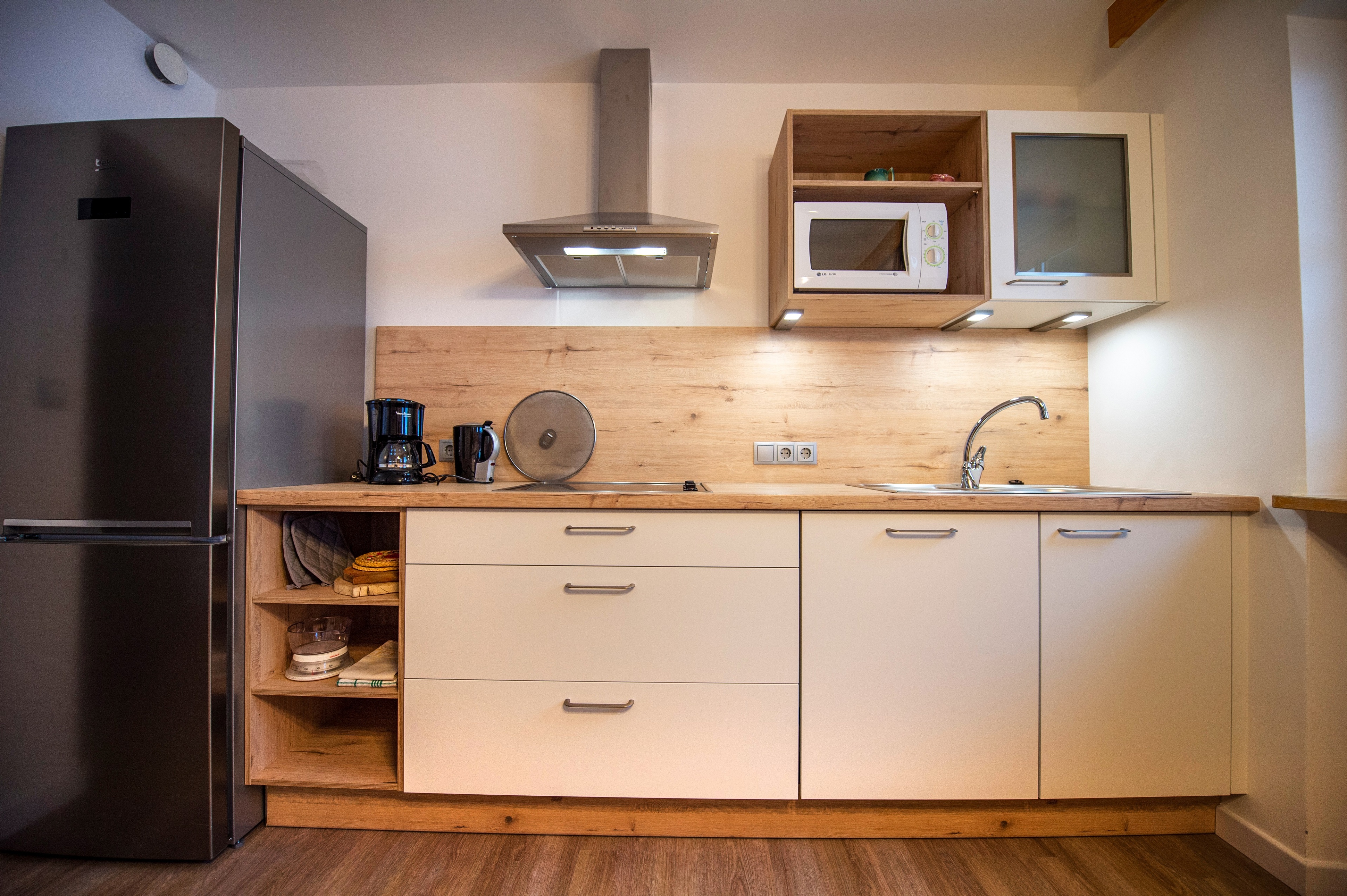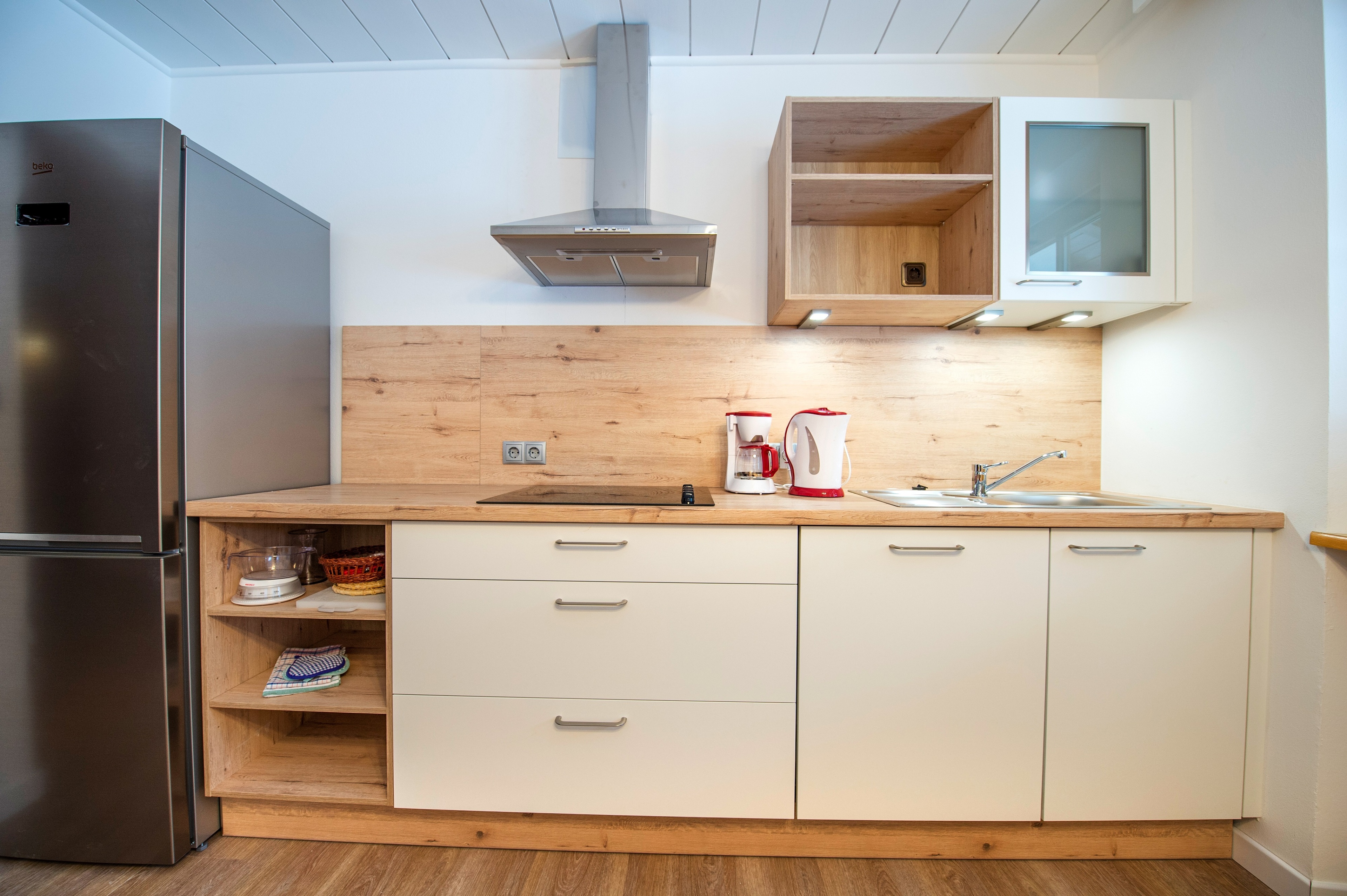 La cucina separata dispone di tutto il necessario per le Vostre vacanze, come per esempio lavastoviglie, piano cottura, macchina per il caffè, frigorifero con freezer, utensili da cucina, posate, stoviglie e molto altro ancora.