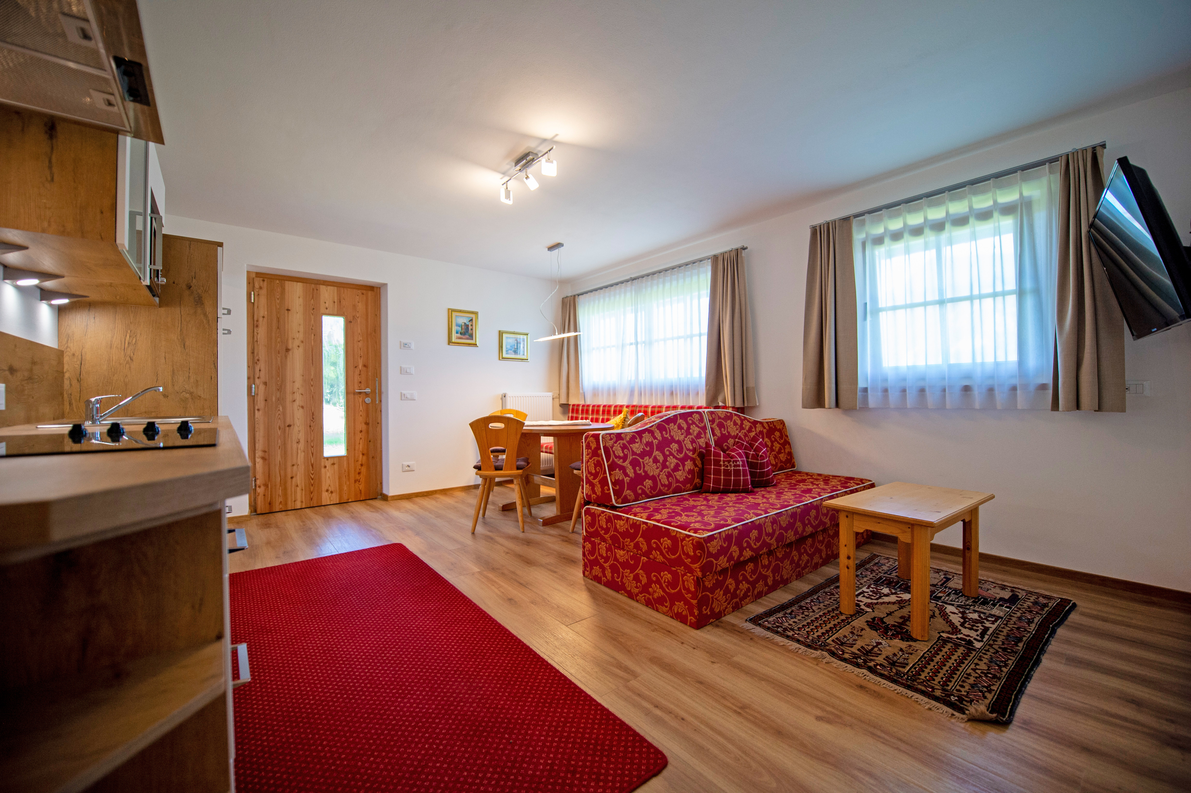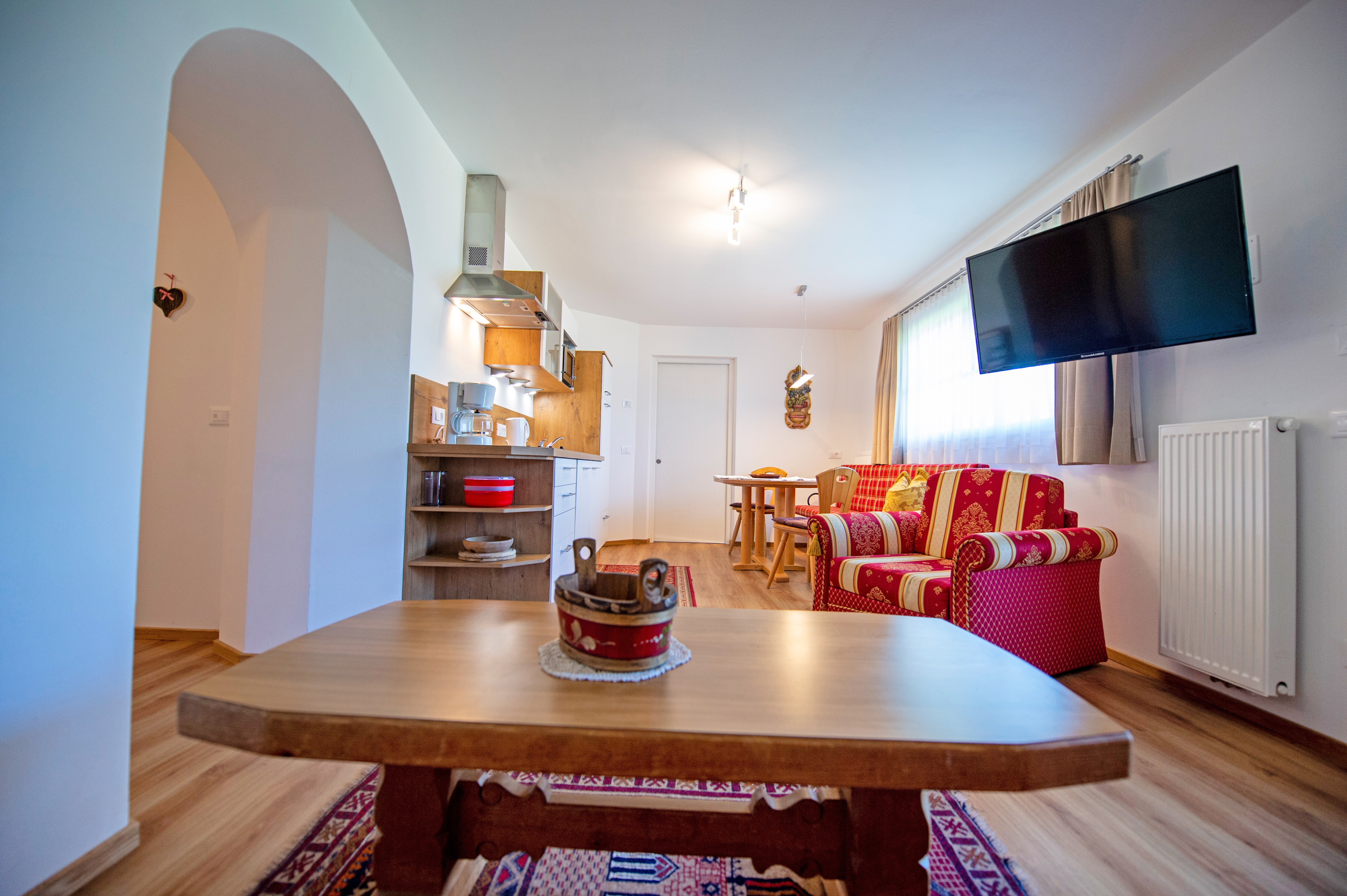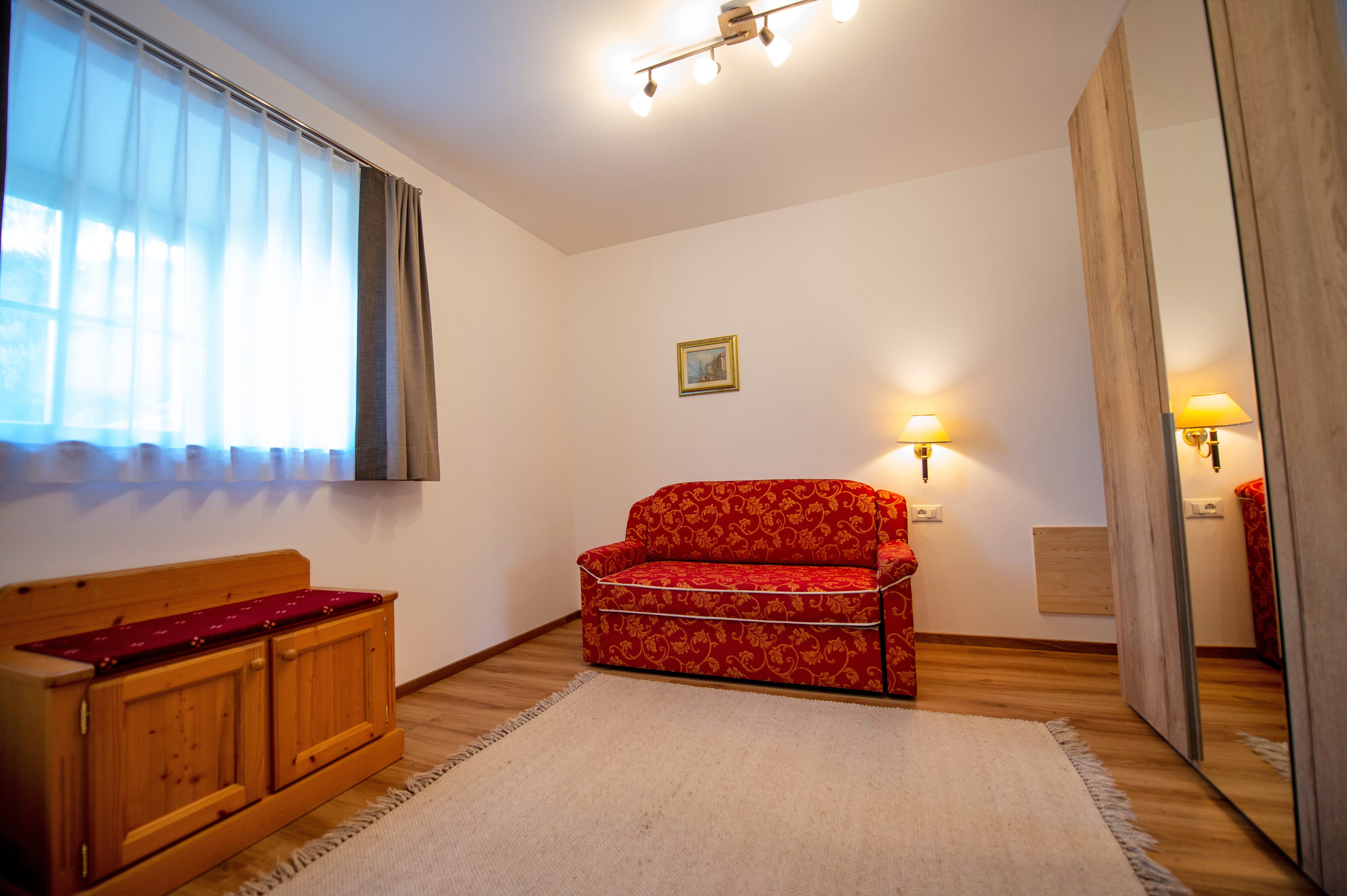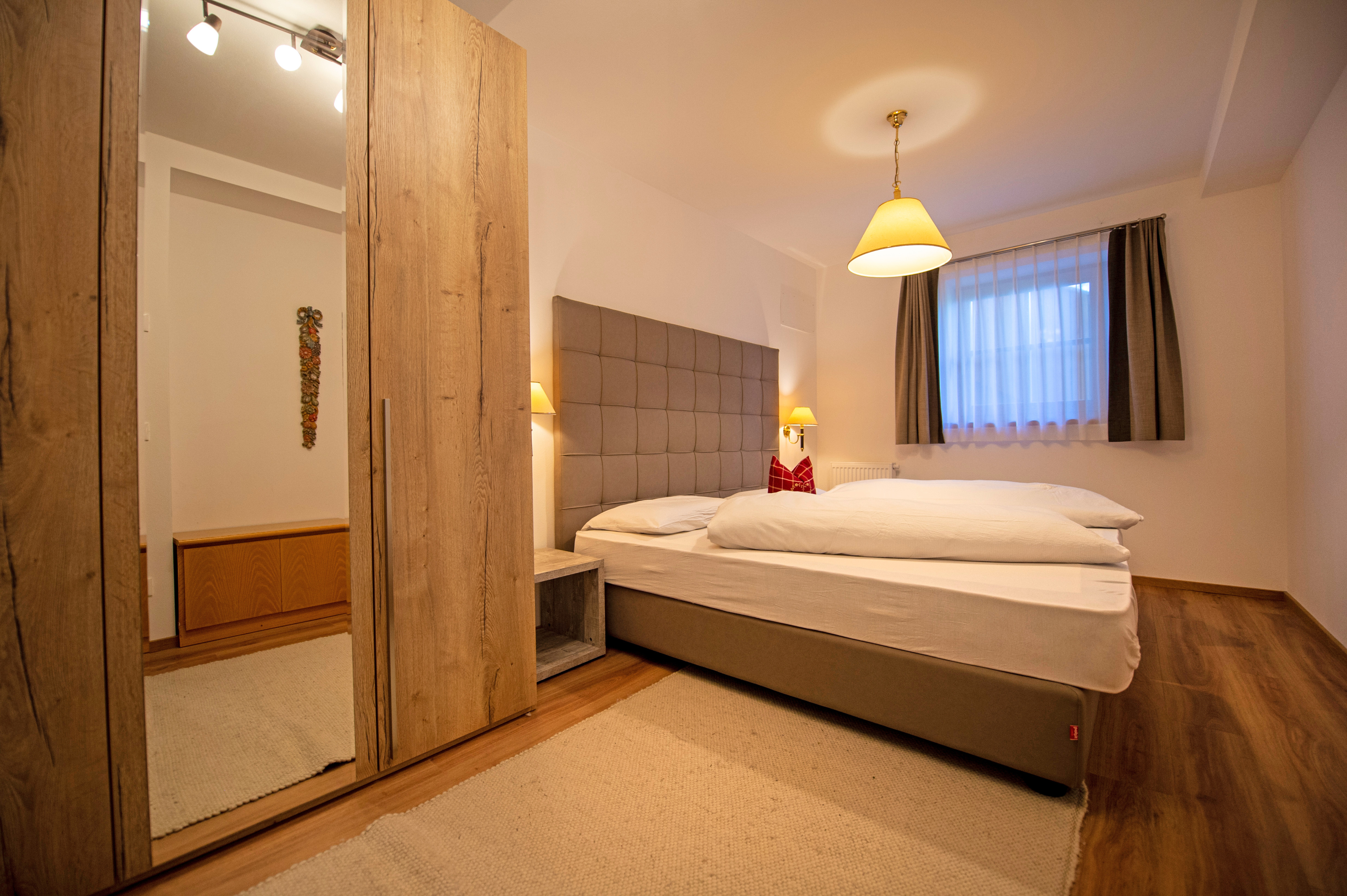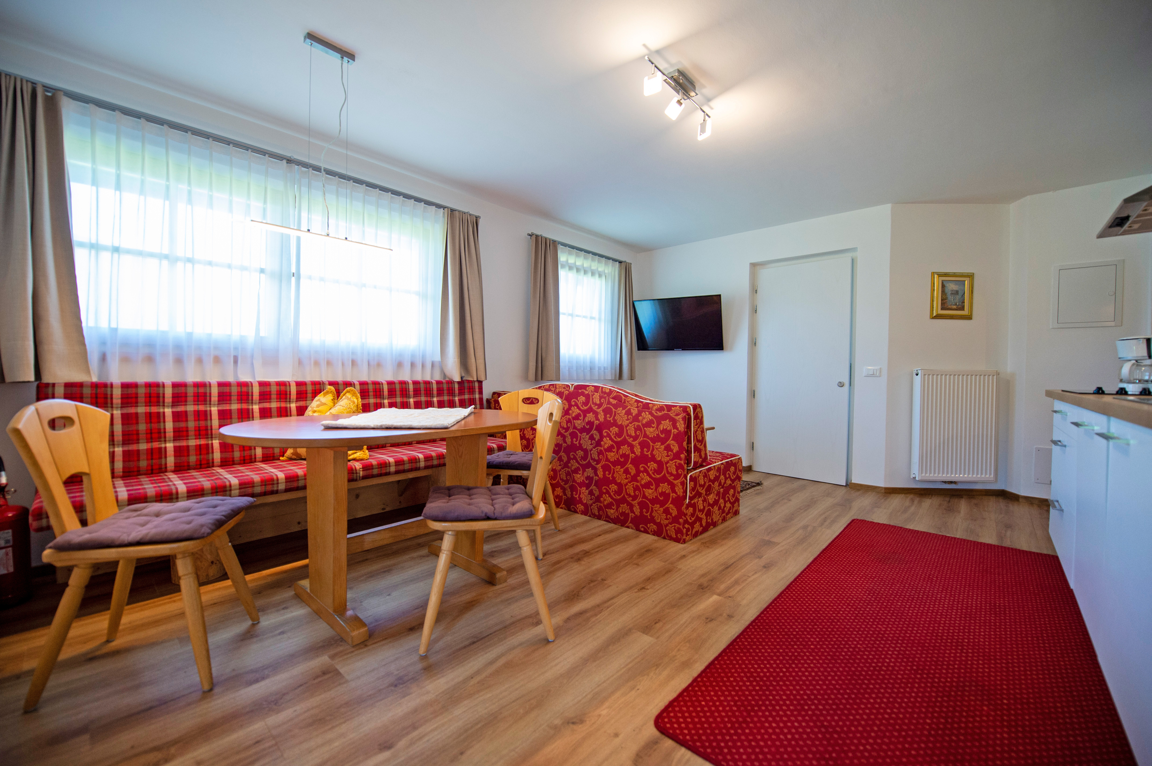 Questo grazioso appartamento è composto da 1 camera da letto matrimoniale, 1 bagno con doccia, un soggiorno con caratteristica stufa tirolese e divano letto singolo ed una cucina separata con tavolo da pranzo. Per la quarta persona verà aggiunta una brandina singola.
