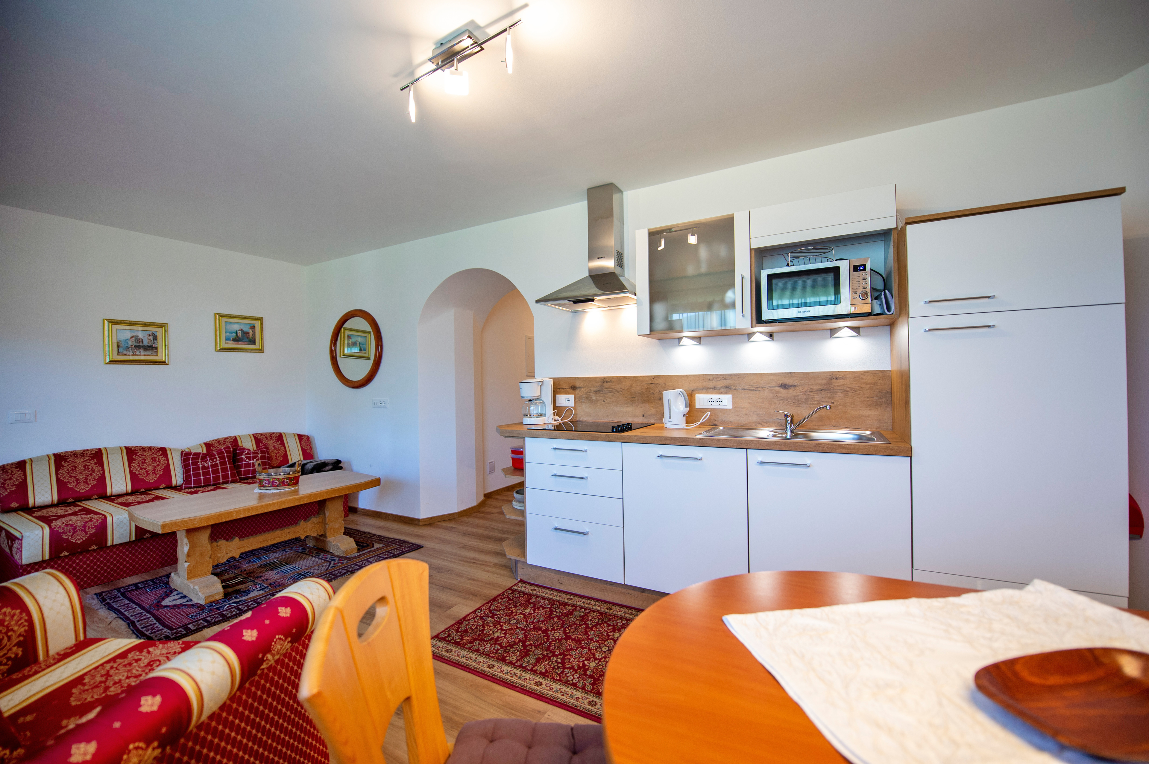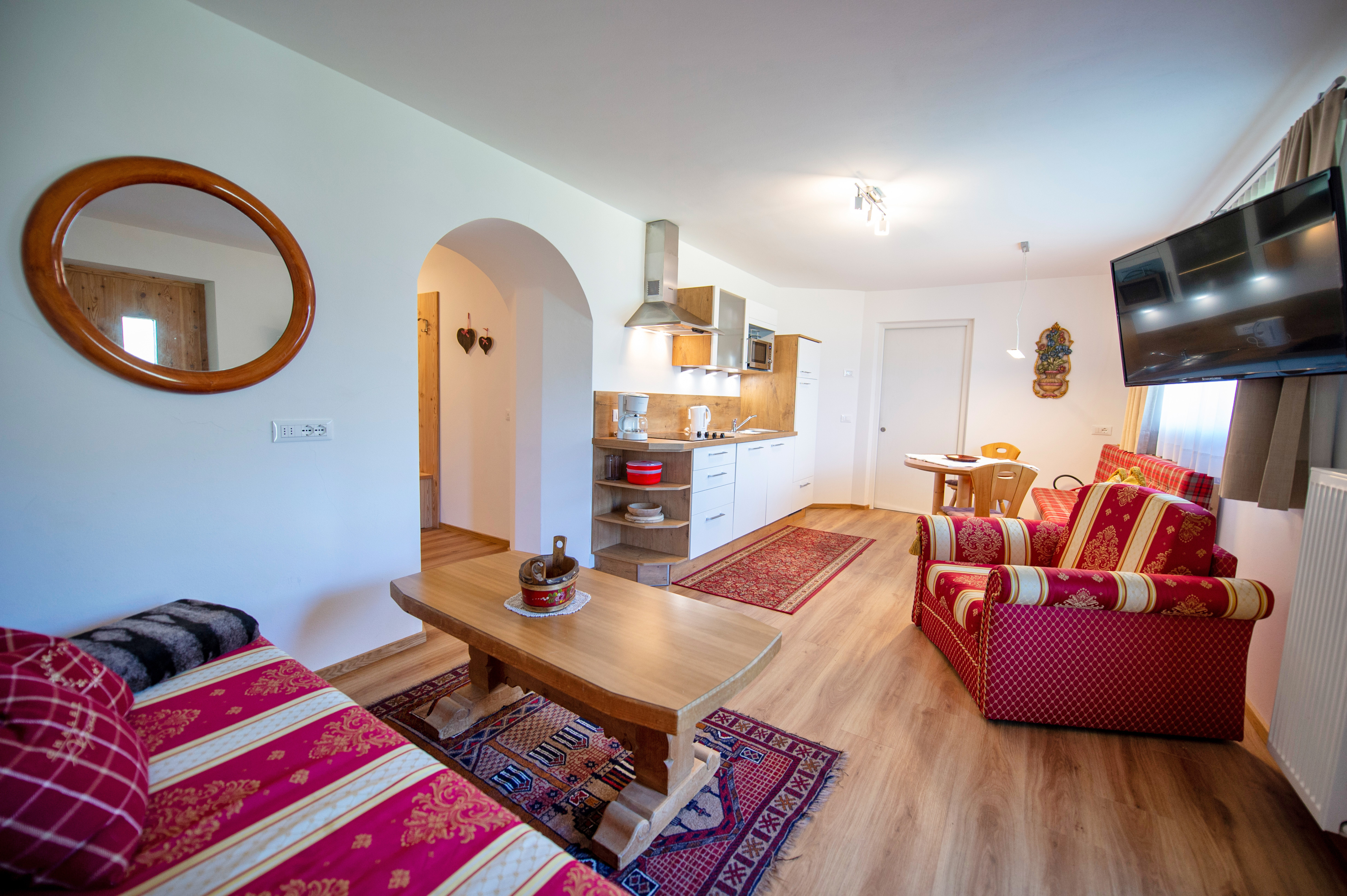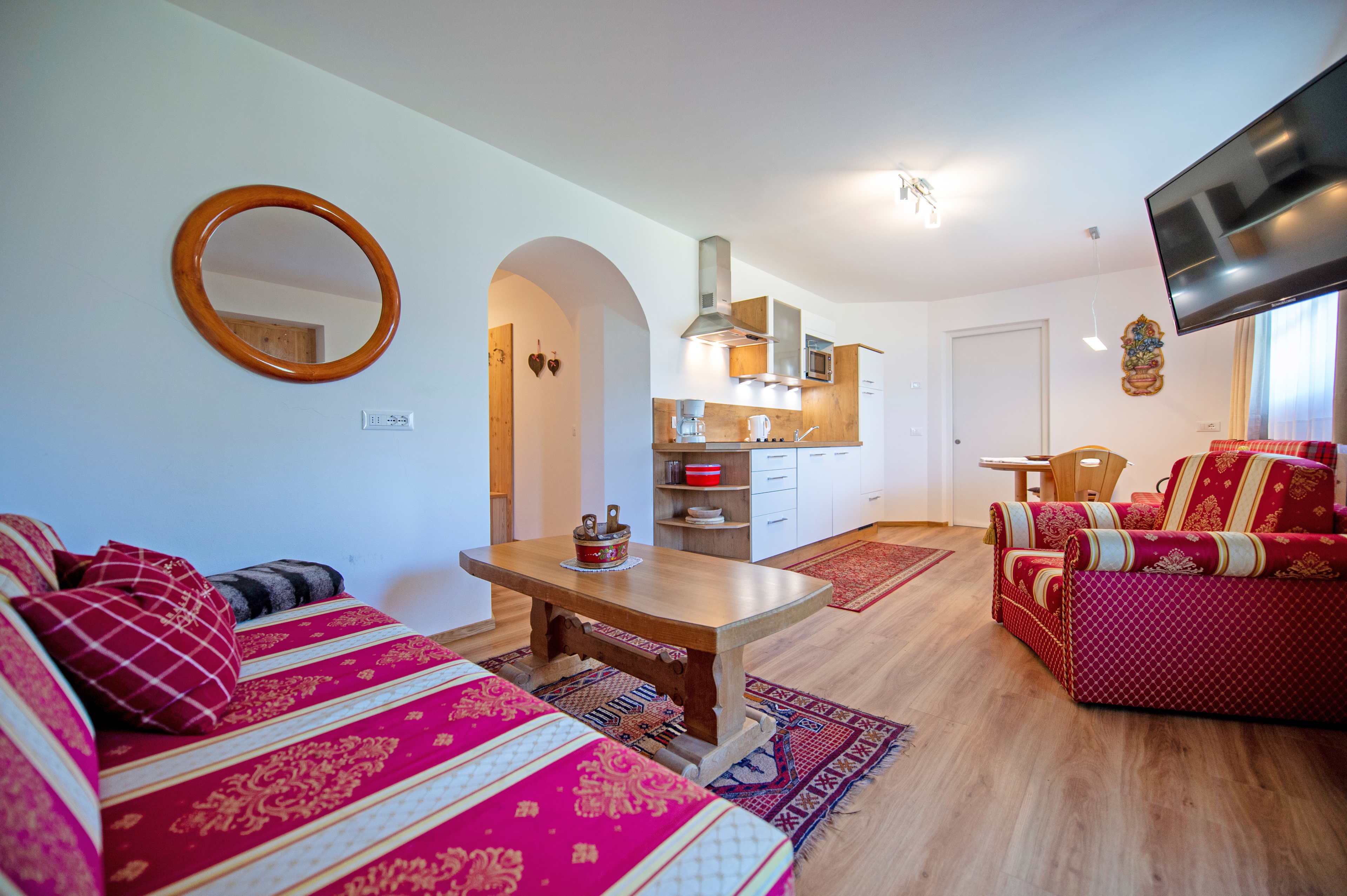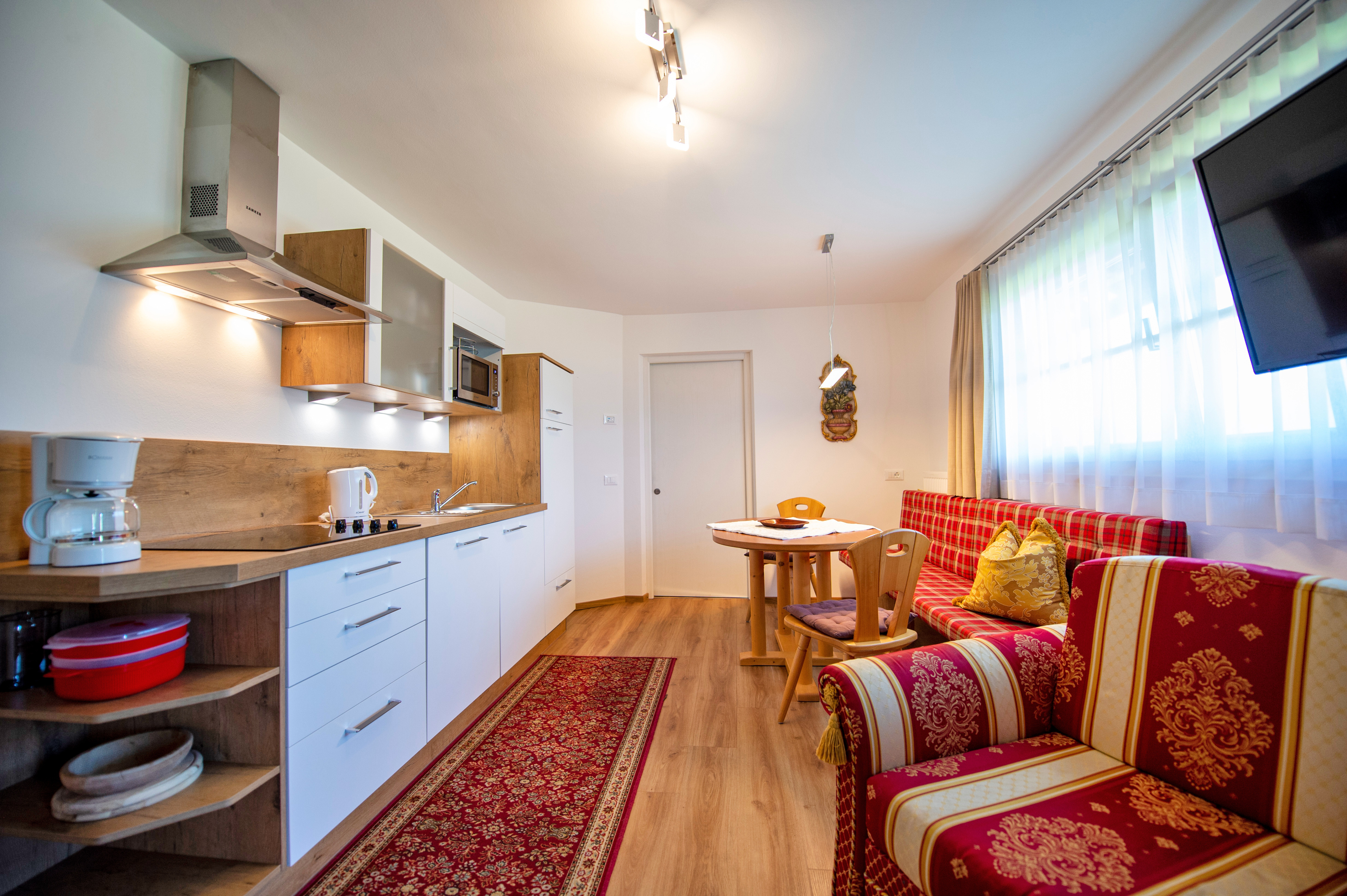 Questo grazioso appartamento è composto da 1 camera da letto matrimoniale, 1 bagno con doccia, un soggiorno con caratteristica stufa tirolese e divano letto singolo ed una cucina separata con tavolo da pranzo. Per la quarta persona verà aggiunta una brandina singola.