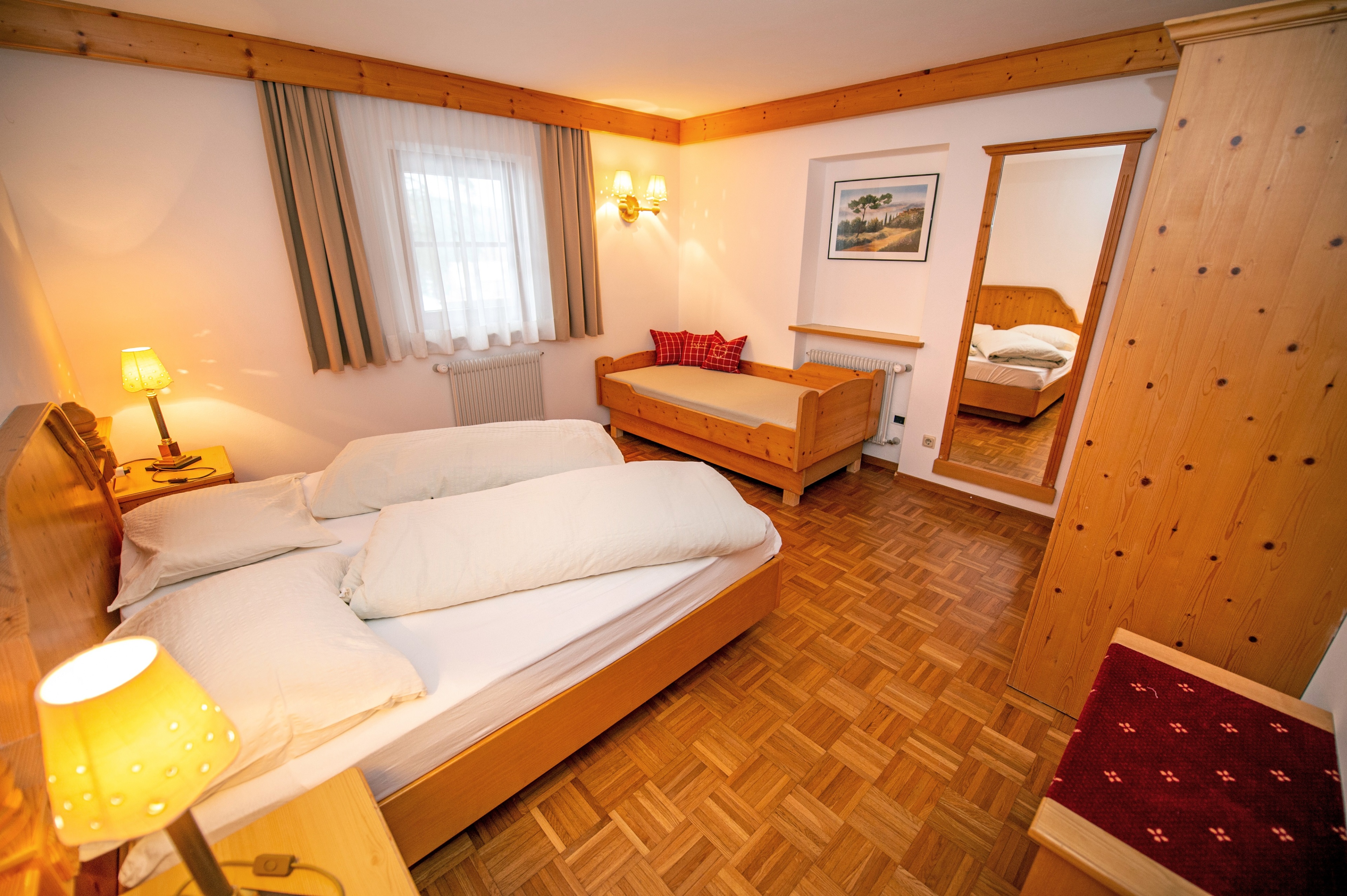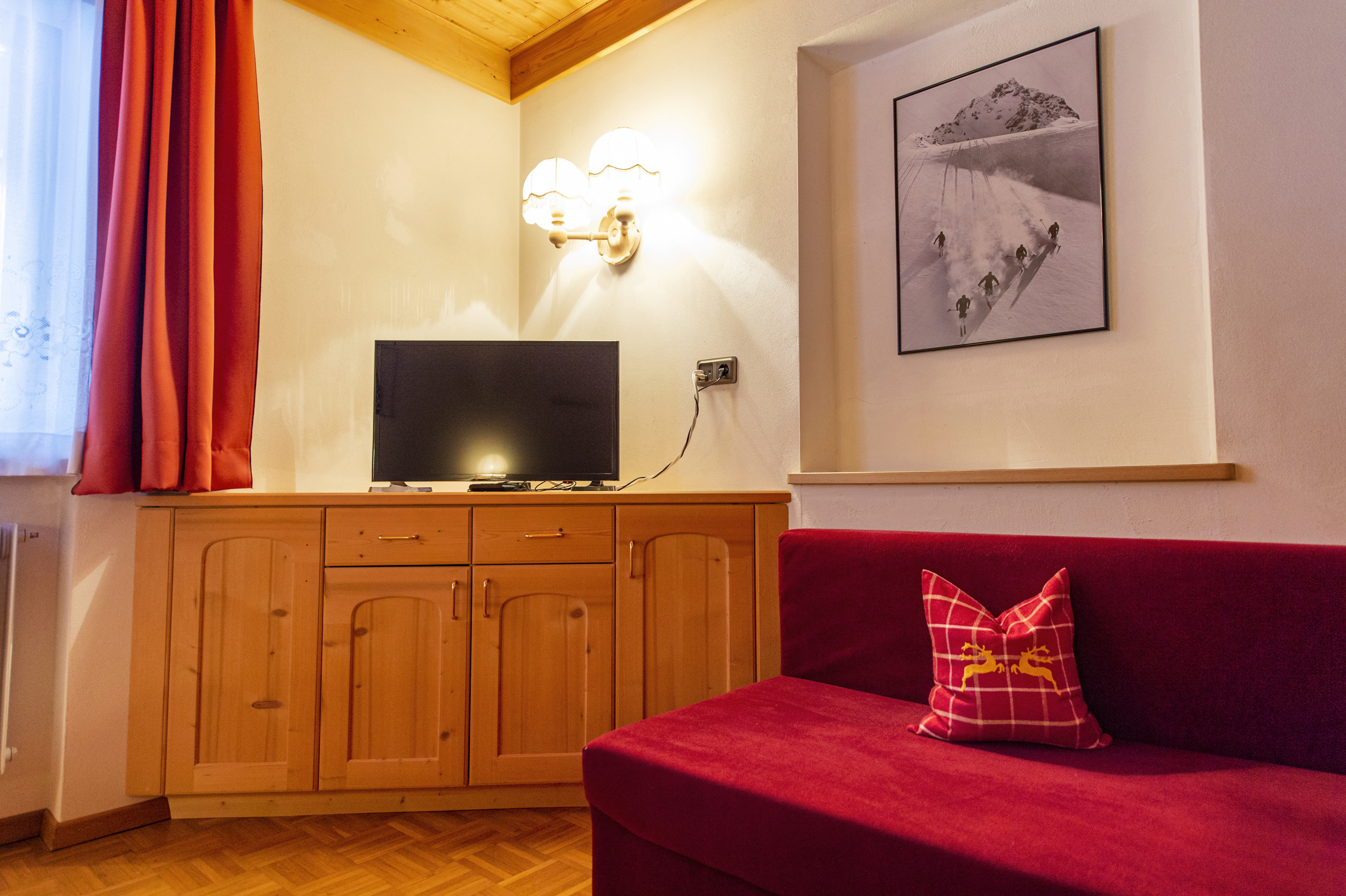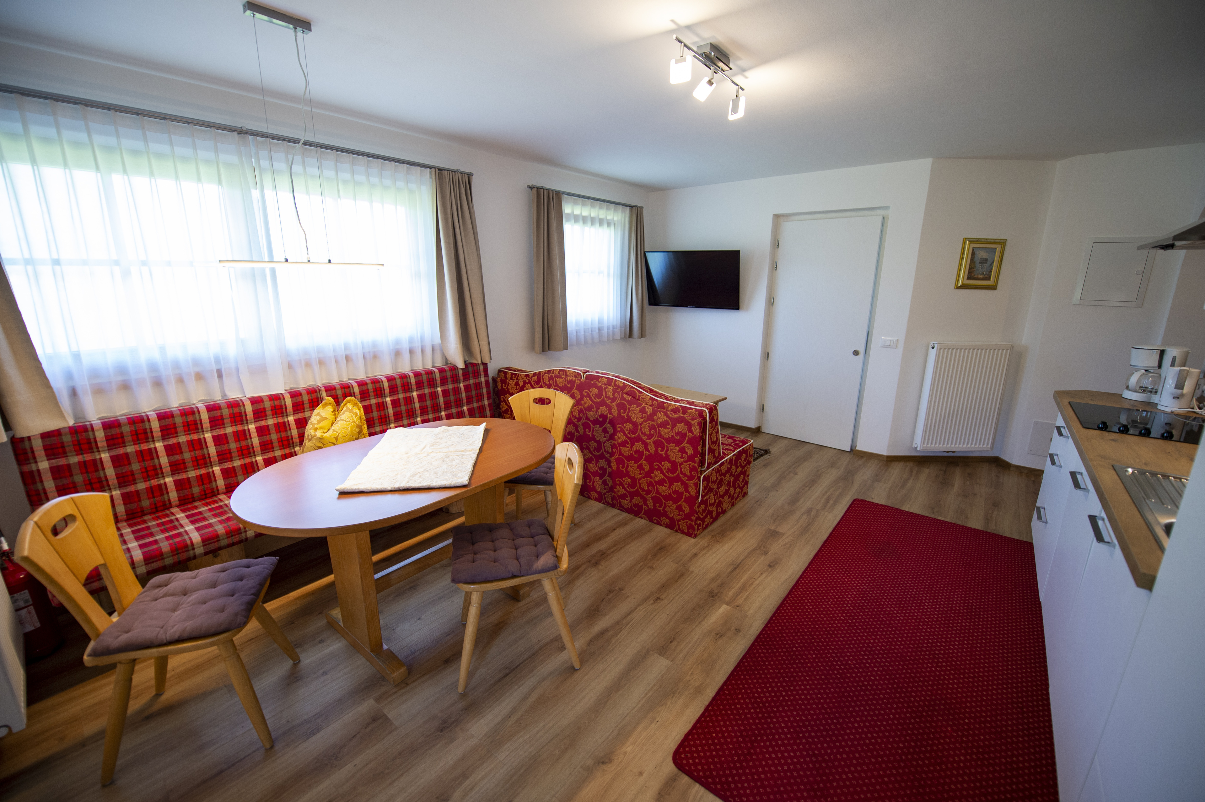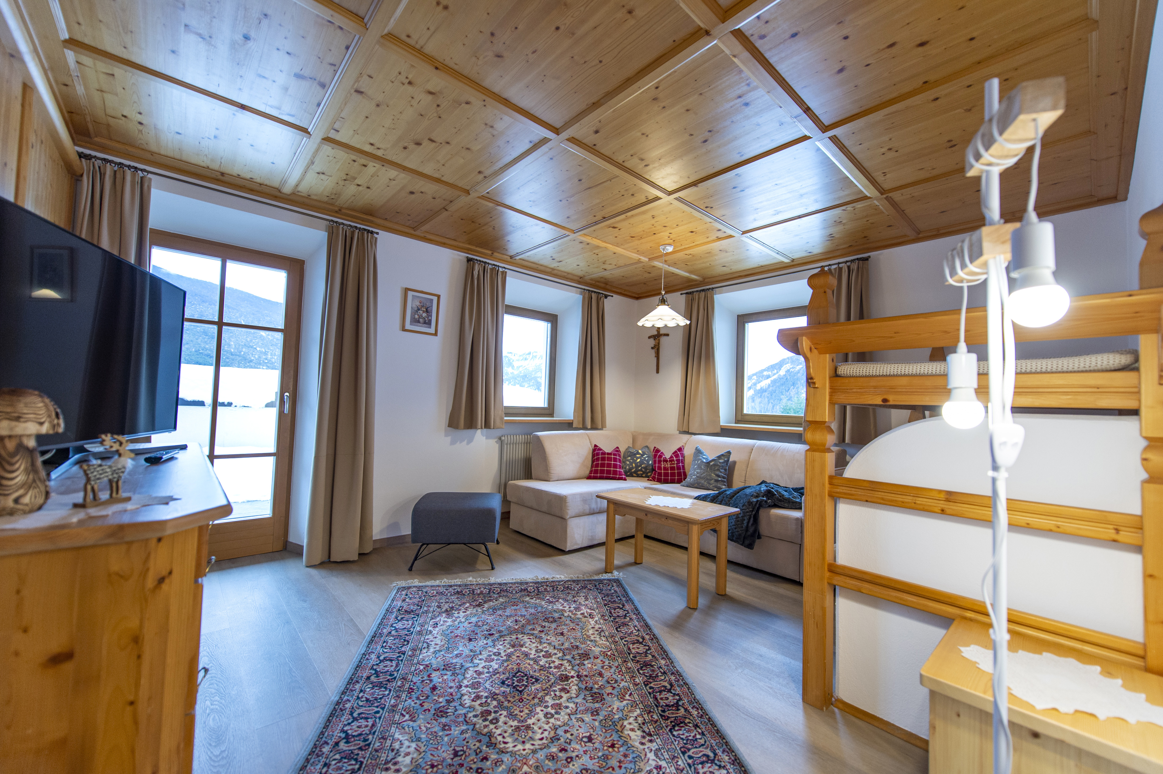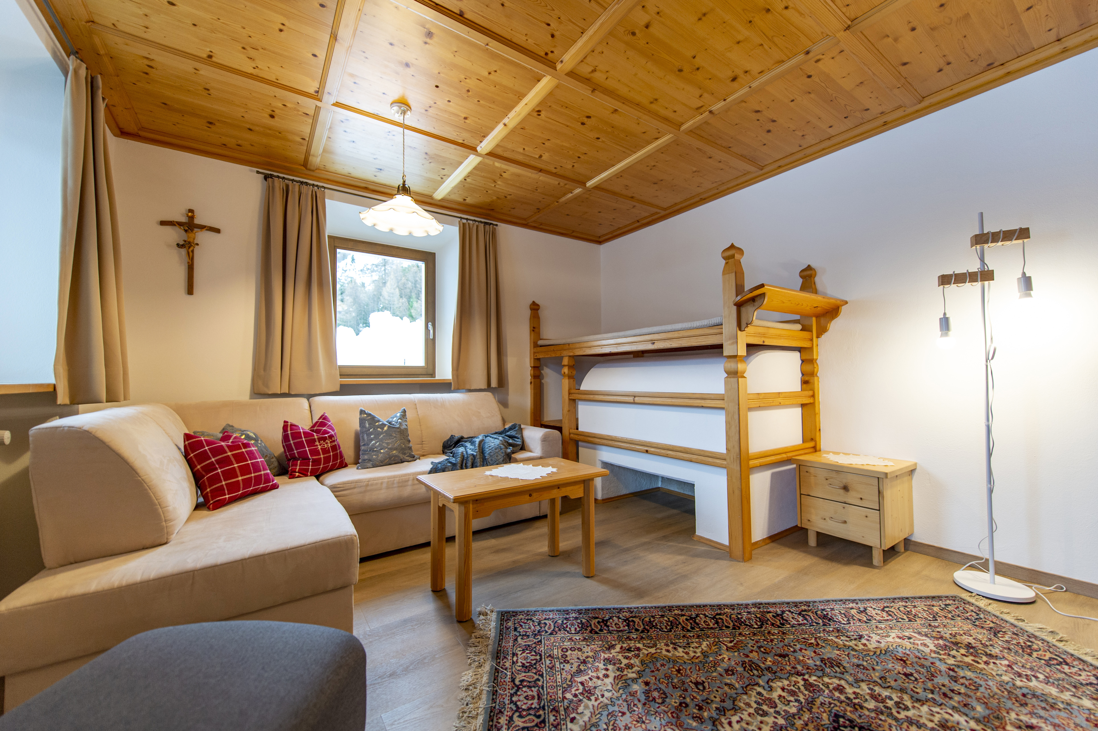 Questo grazioso appartamento è composto da 1 camera da letto matrimoniale, 1 bagno con doccia, un soggiorno con caratteristica stufa tirolese e divano letto singolo ed una cucina separata con tavolo da pranzo. Per la quarta persona verà aggiunta una brandina singola.